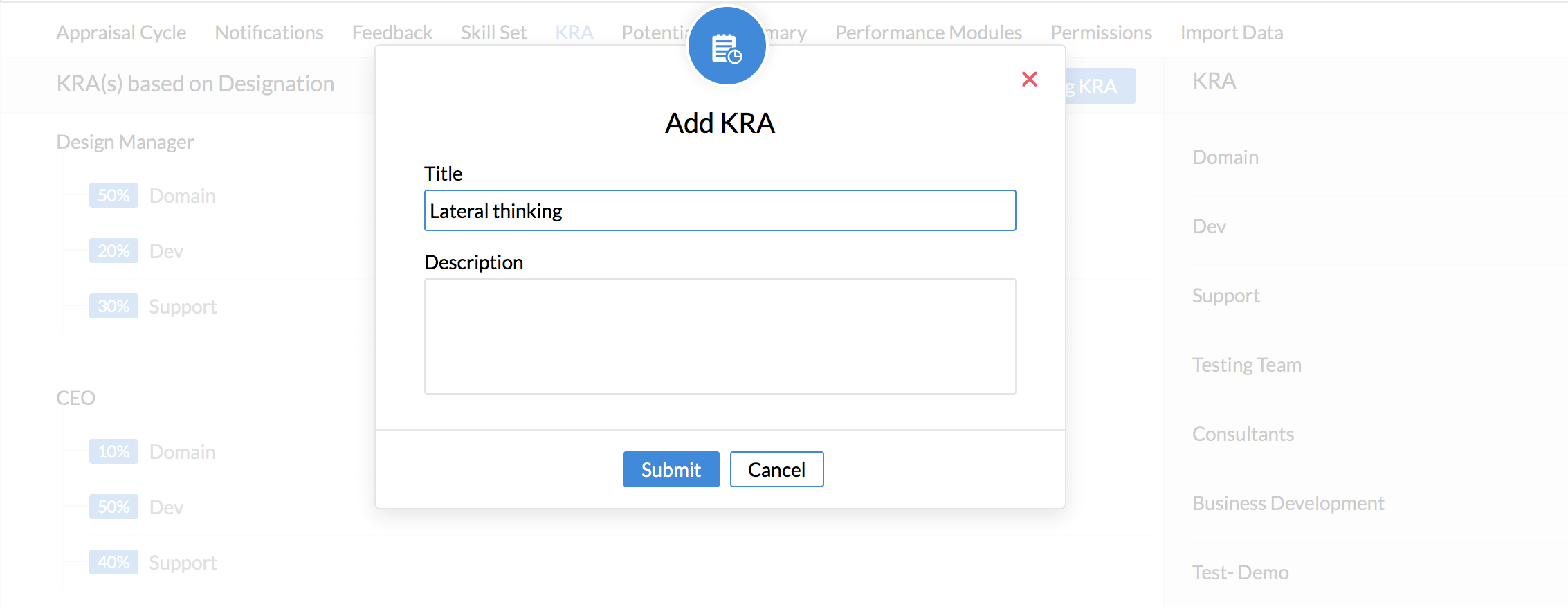 - Give a weightage for the KRA if required and click on 'Submit'