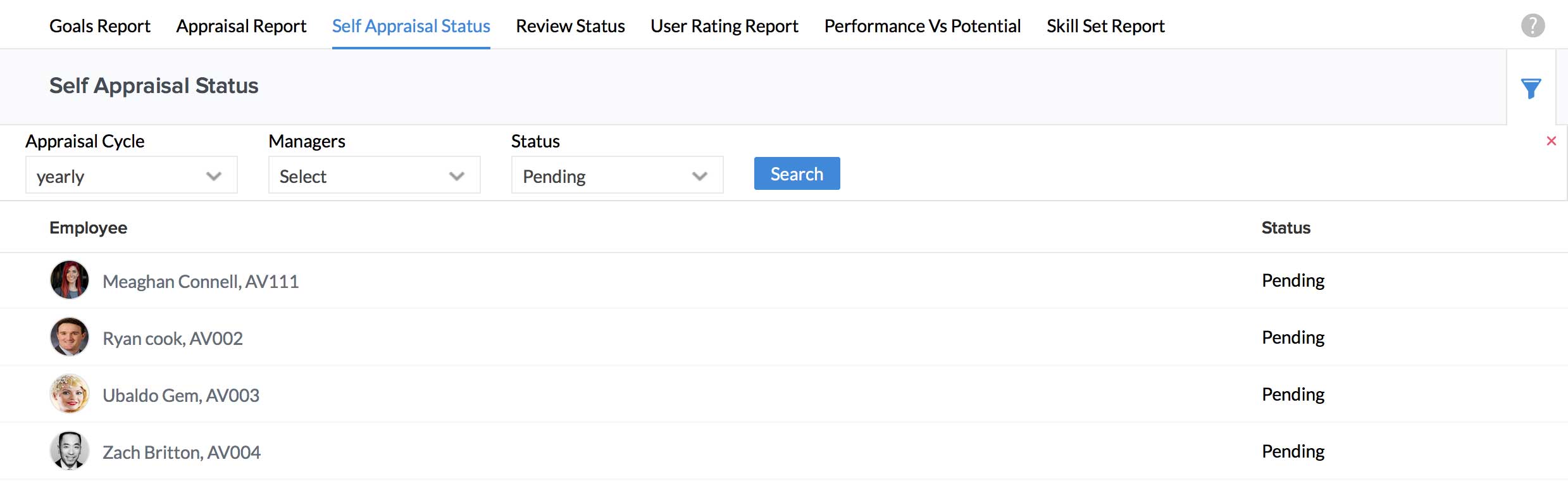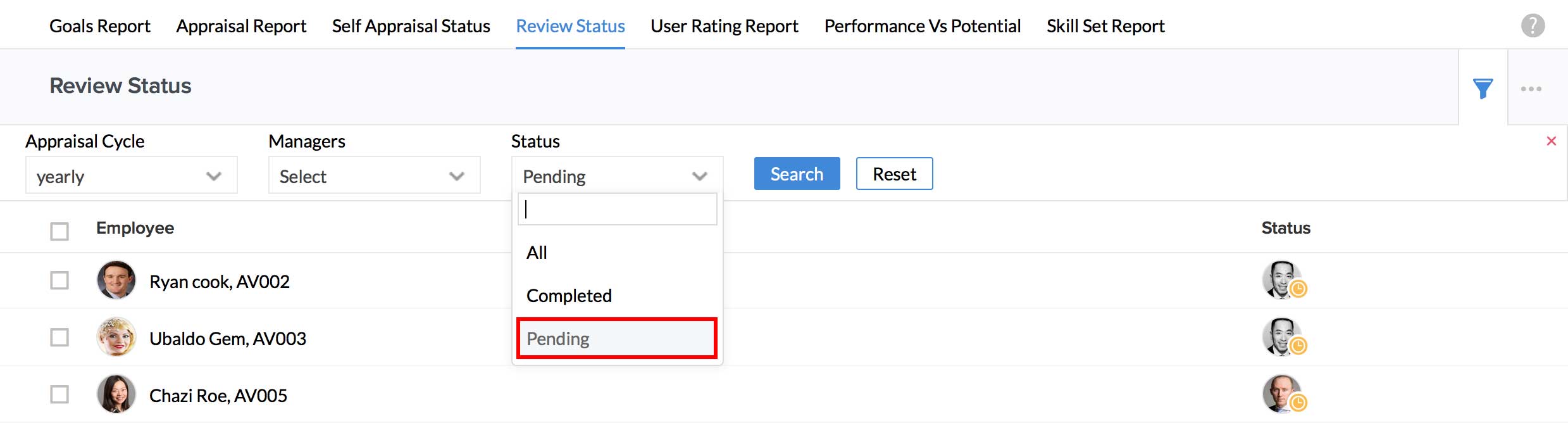 I would like to see the self-appraisals that are in pending status for a particular appraisal cycle. Is this possible?