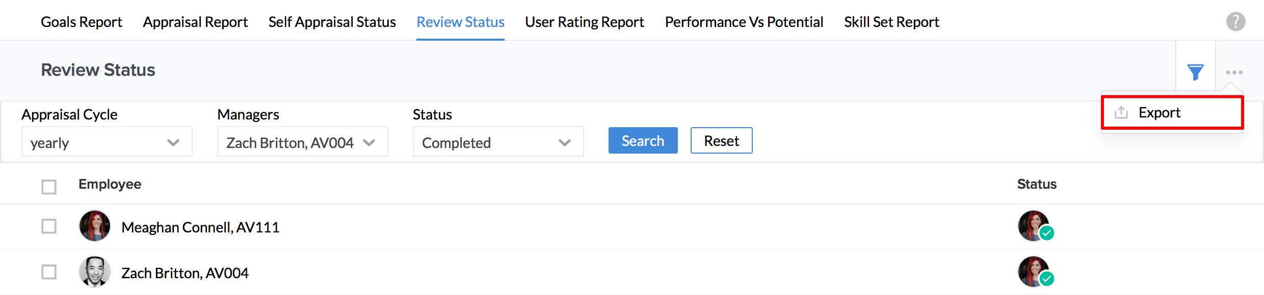 I would like to export the list of completed reviews of a particular manager. Is this possible?