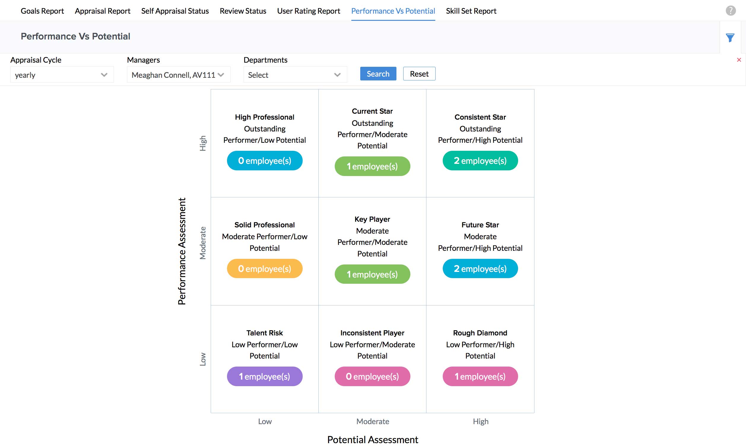 - Click on the respective box (in this case, the Consistent Star box) to see the list of employees who fall under the specified category, as shown in the image below.