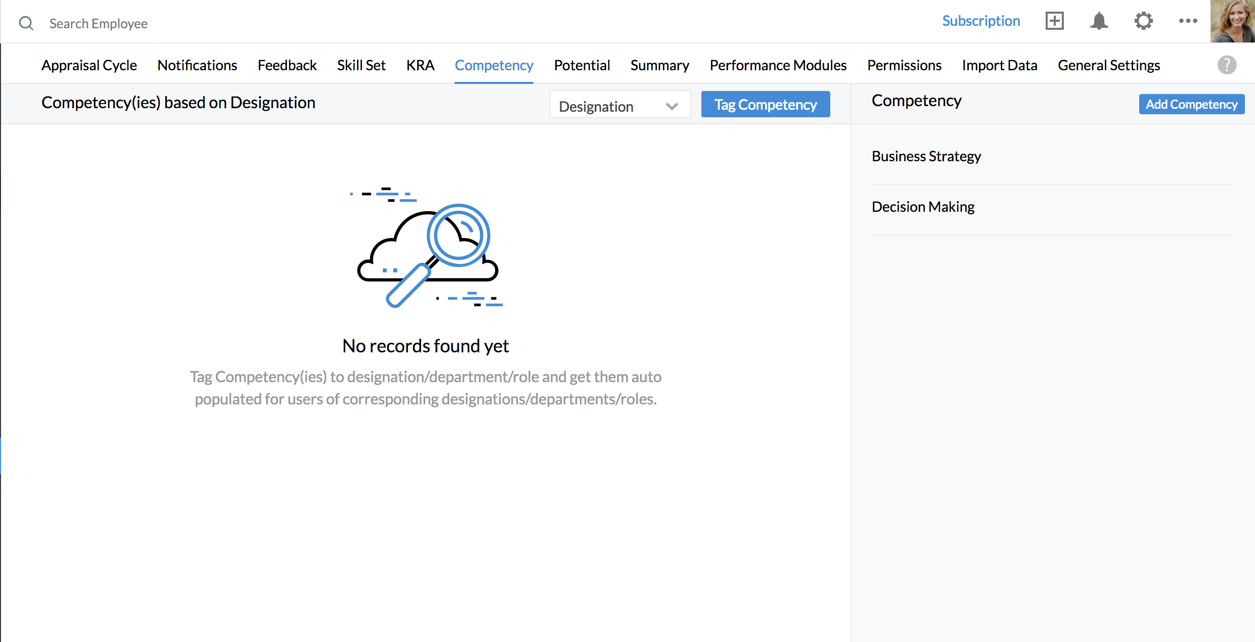 - From your home page, go to Performance > Settings > Competency