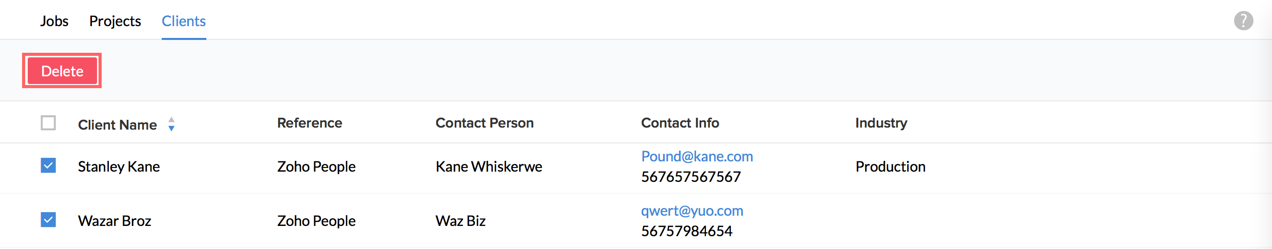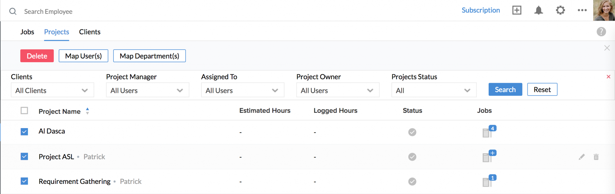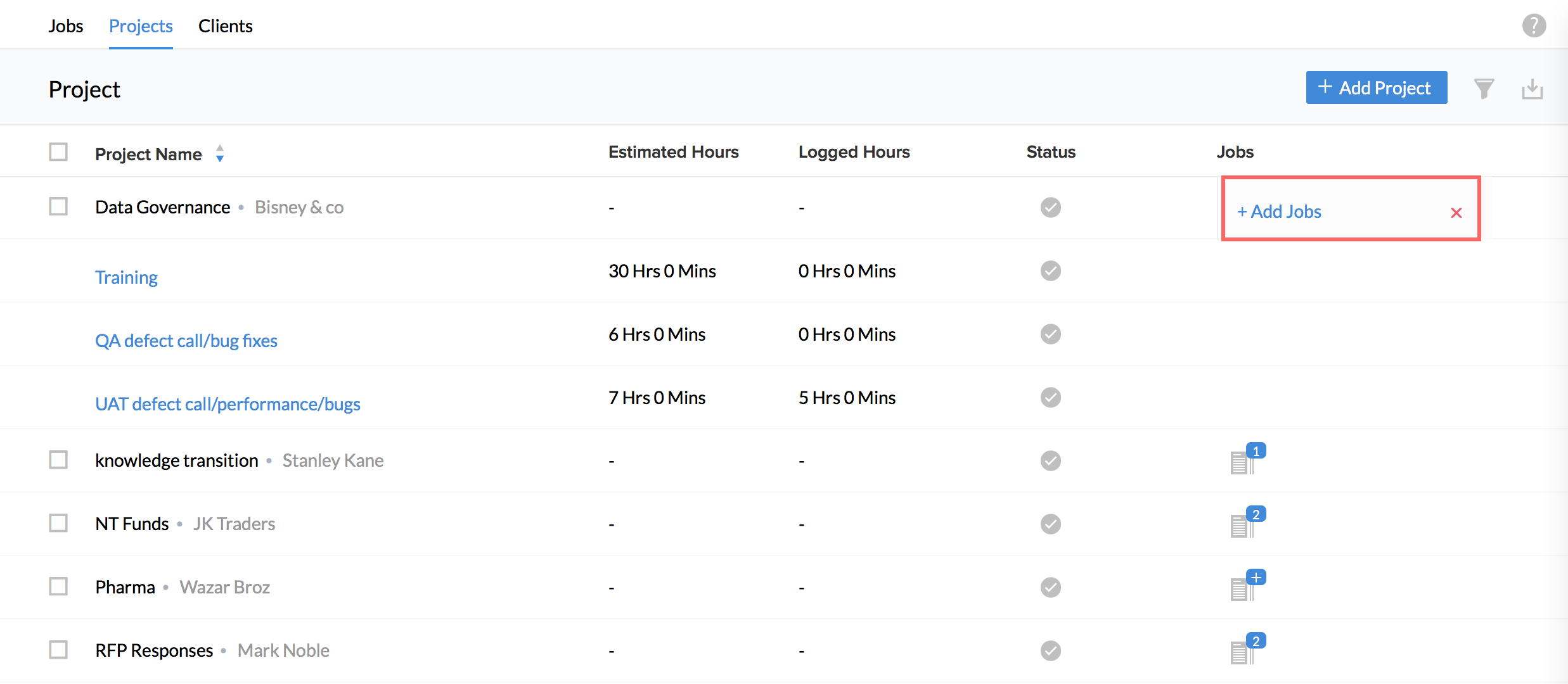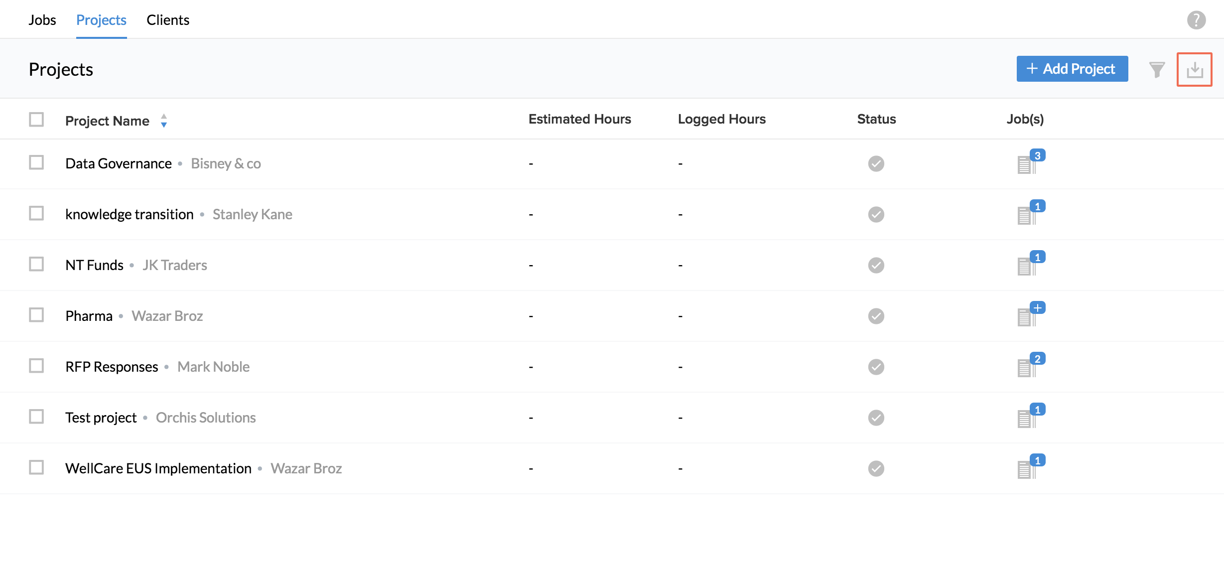 You can also sort Jobs, Projects and Clients in Ascending or descending order using the Up arrow and the down arrow in the Job Name, Project Name and the Client Name column.