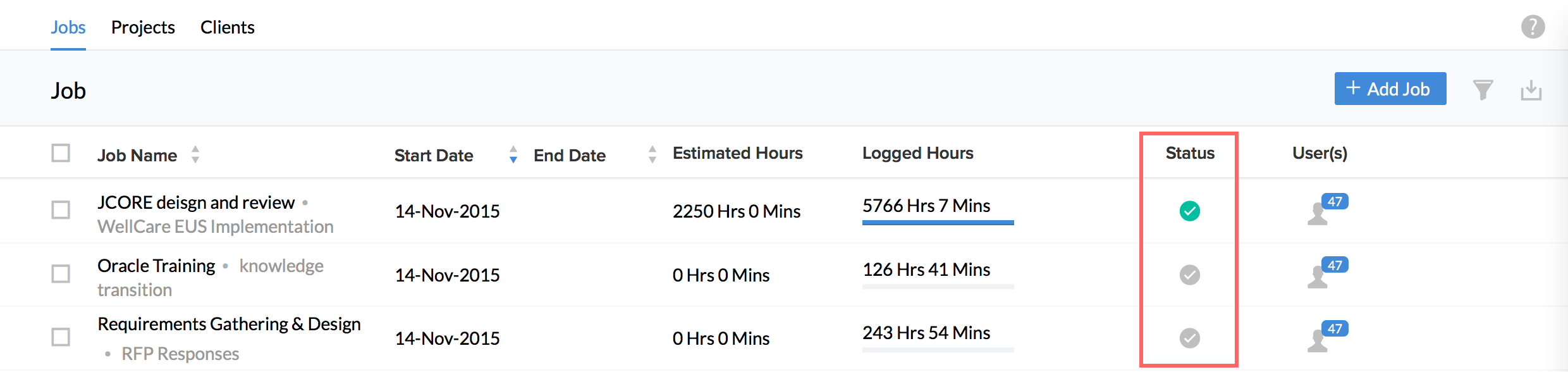 Tip : If you would like to re-open a completed job, use the filter at the right corner, select 'Completed' from the Job Status dropdown and hit search. You will be able to the completed jobs and the status can be changed.