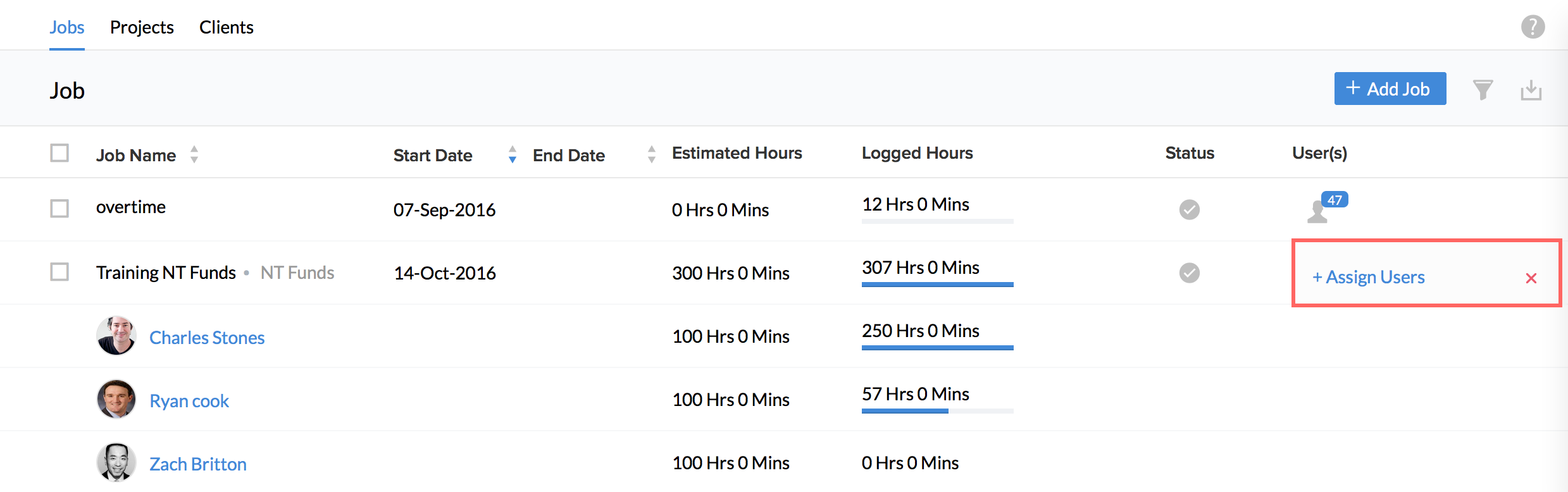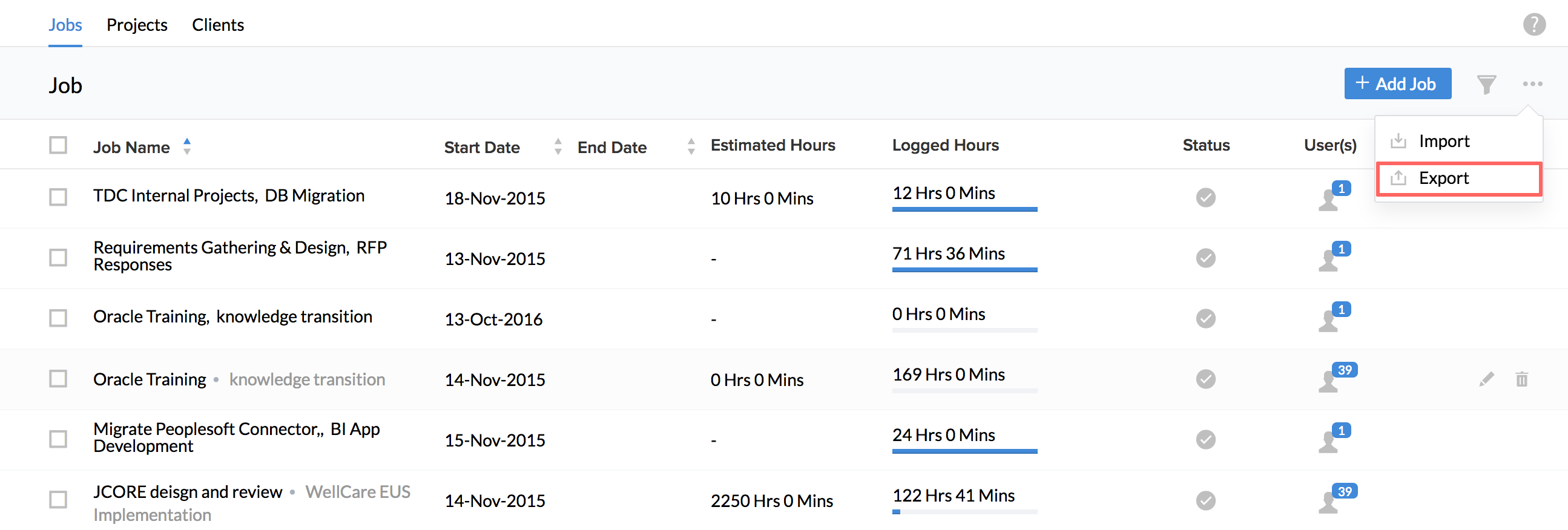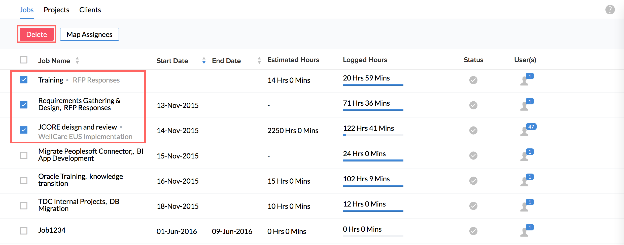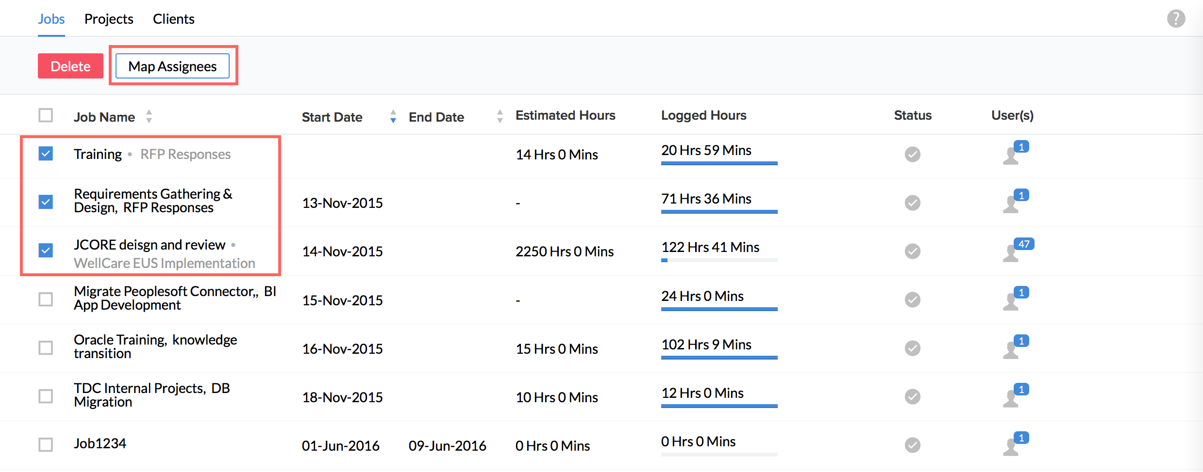 Your jobs will now get imported onto the system and you will be able to see them along with the users assigned if you go to Projects/Jobs > Jobs