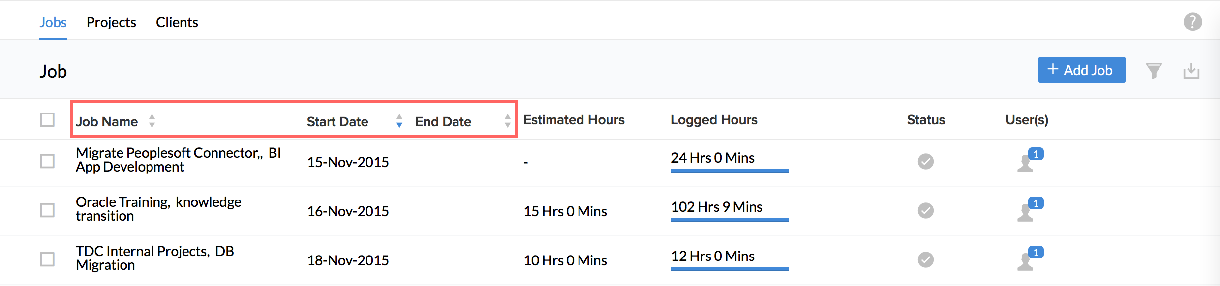 - Use the Up arrow and the Down arrow under Start Date and End date to sort the Jobs in ascending or descending order