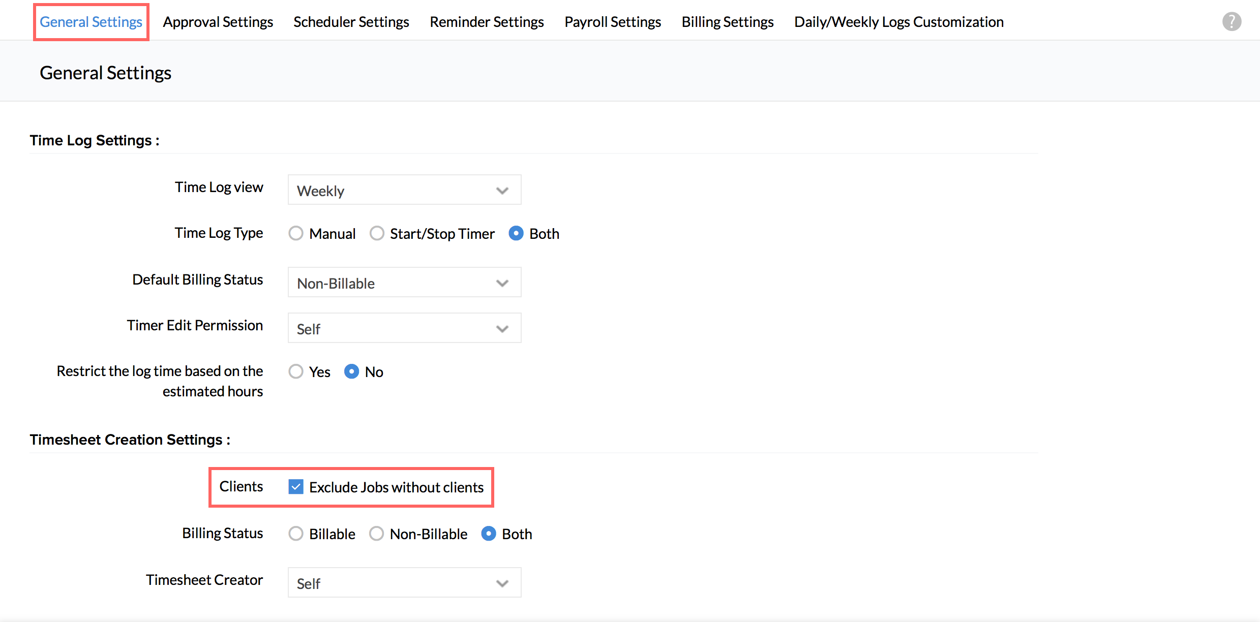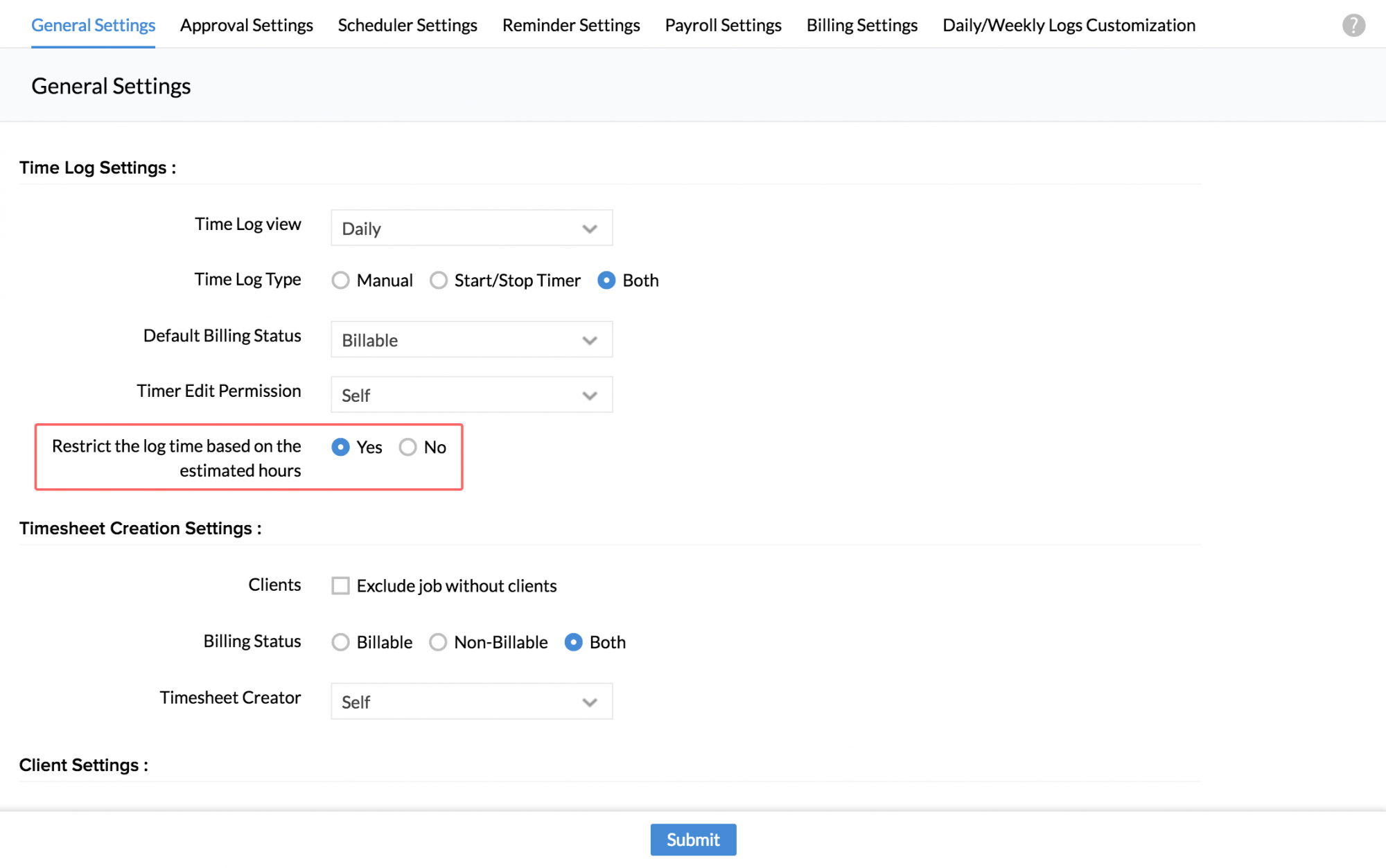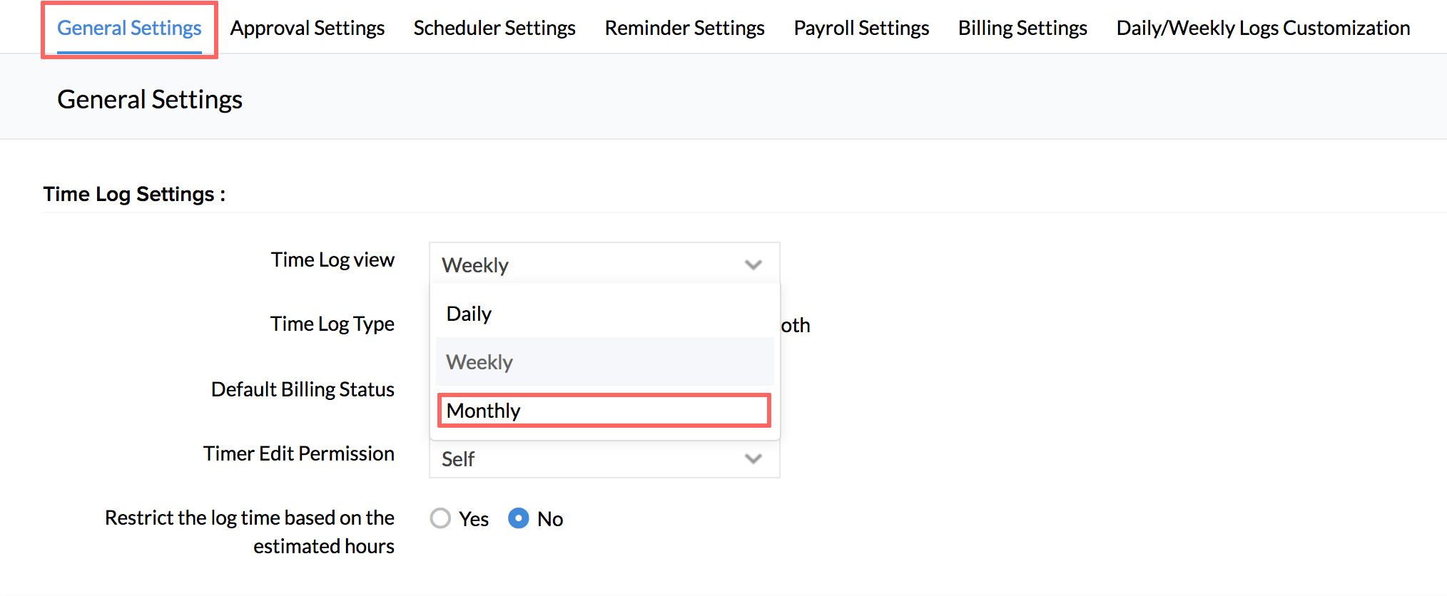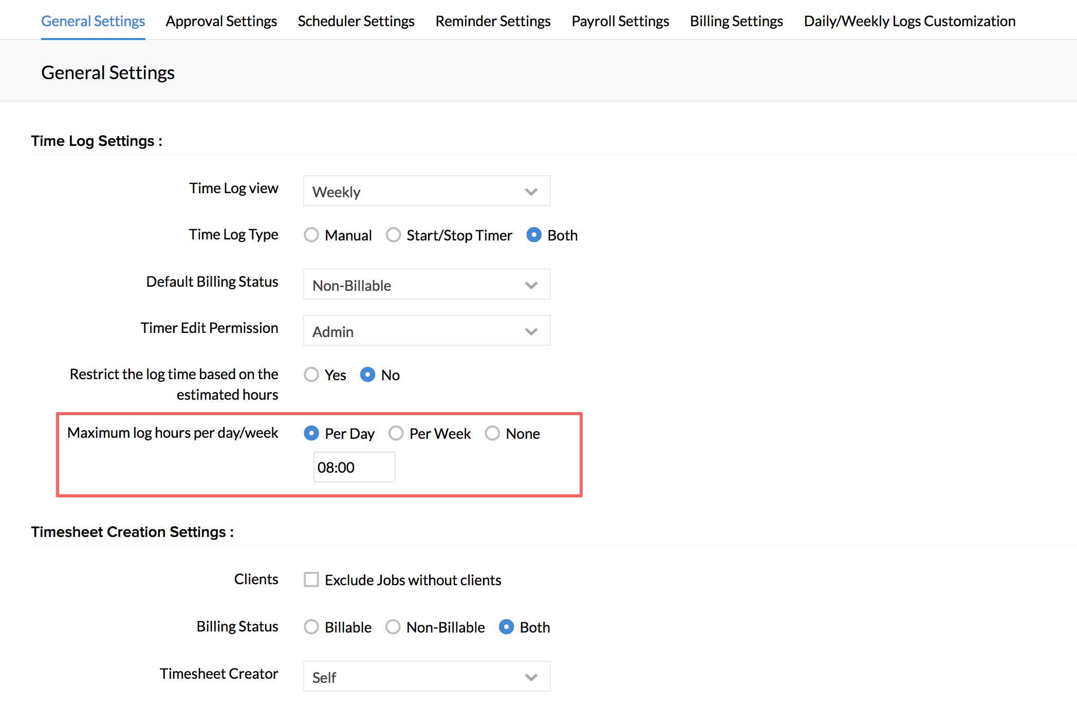 - Under Time Log Settings, go to Restrict Time Logs for and select 'Weekend(s)' and 'Holiday(s)'