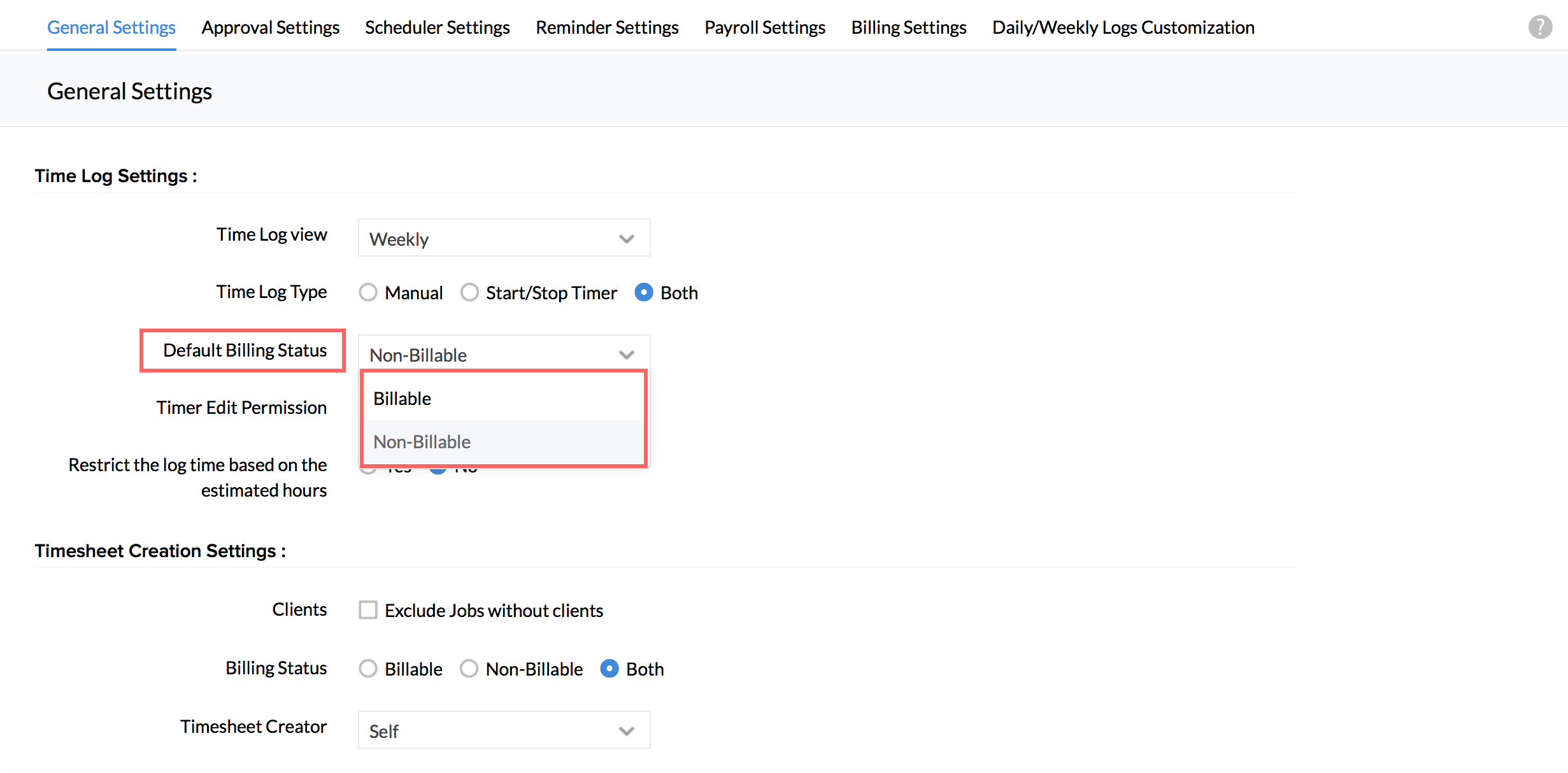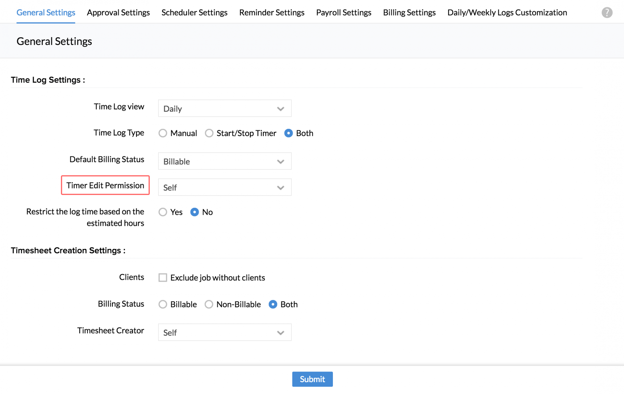 Note:You can prevent any edits being made to the time logs/timesheets of the past,by the user, by configuring a pay period.