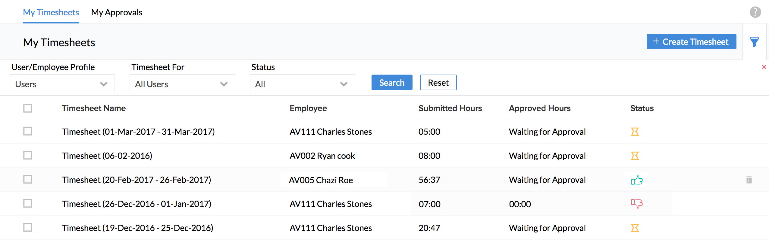 Timesheets in Zoho People: Enables you to log time and generate timesheets for various recorded jobs. The generated timesheets can be later sent for approval, used for billing purpose and the data can also be used for payroll processing.