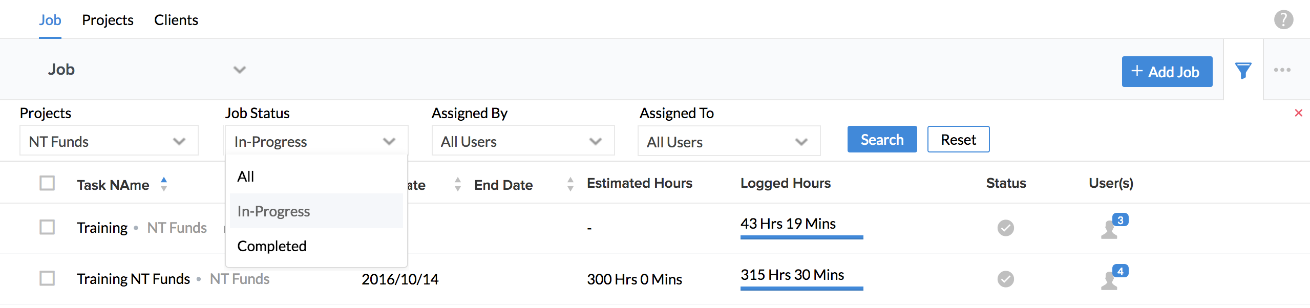 - Under 'Projects', select the Project and under 'Job Status', select 'In-Progress
