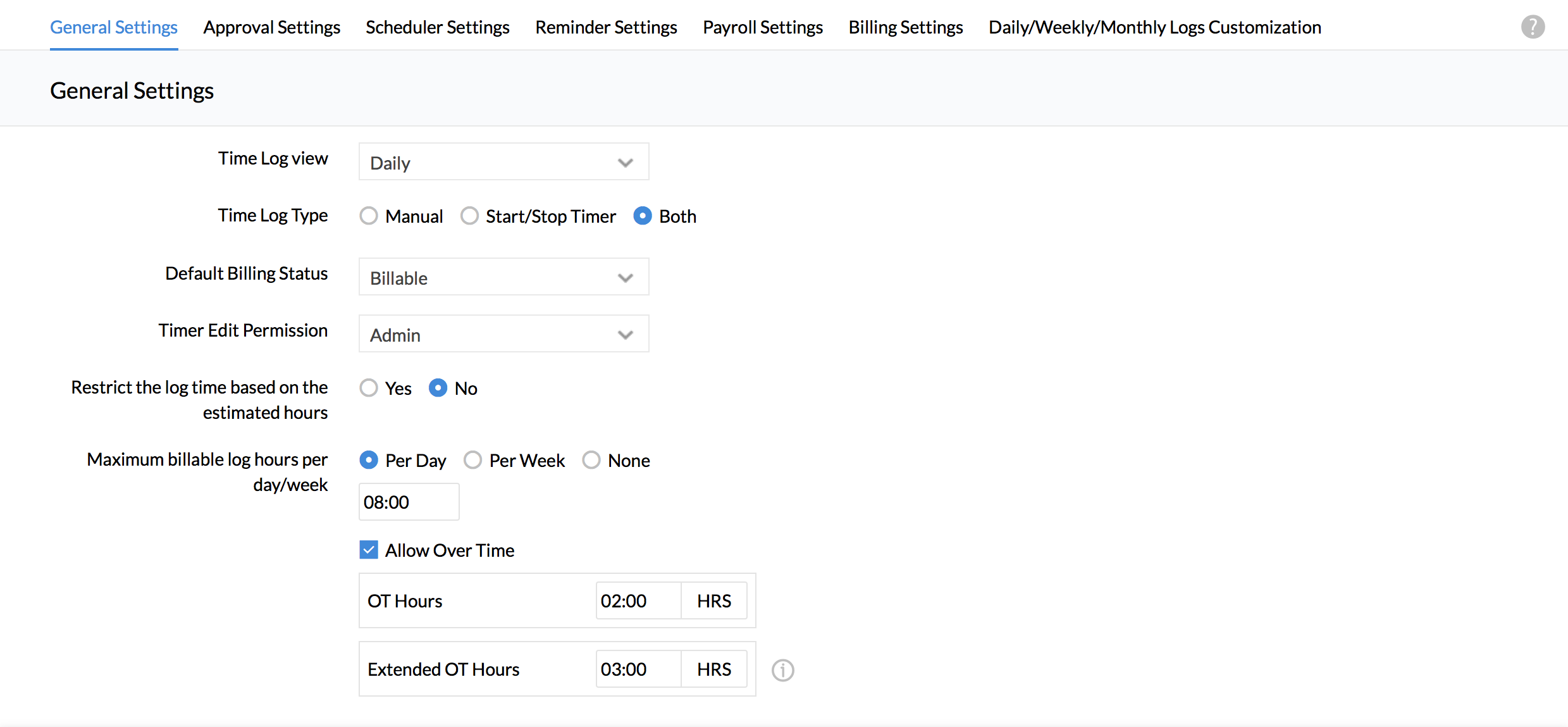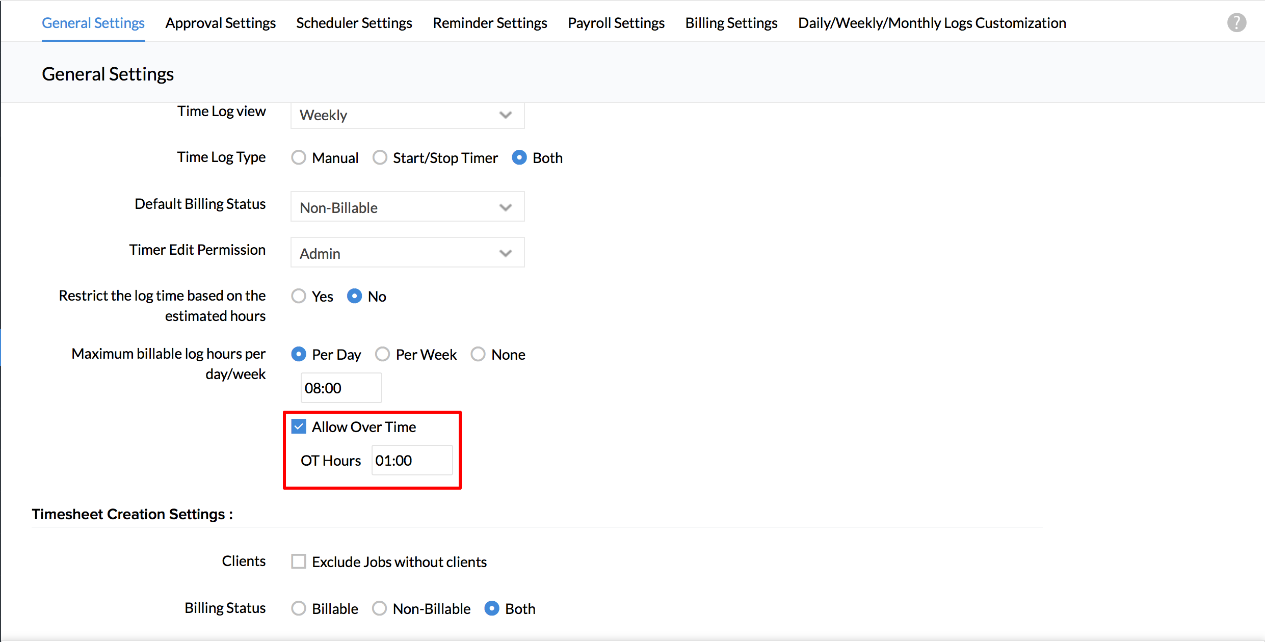 - Under Time Log Settings, check 'Allow Overtime'