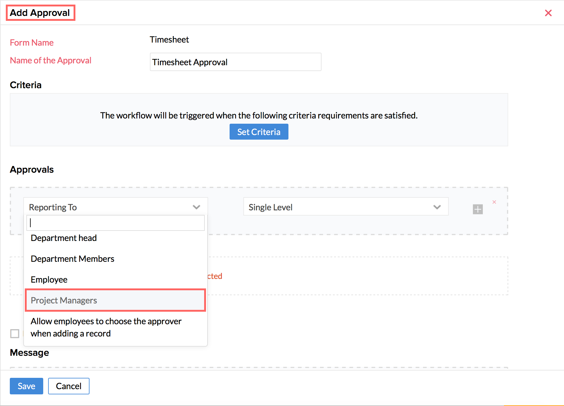 - Under 'Criteria', you can create a criteria using the fields of the job form and its related forms