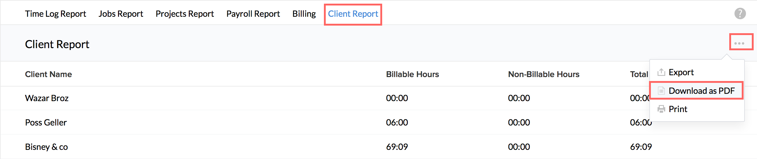 I would like to download a report of the billable and non billable hours of a Client. How do I do this?
