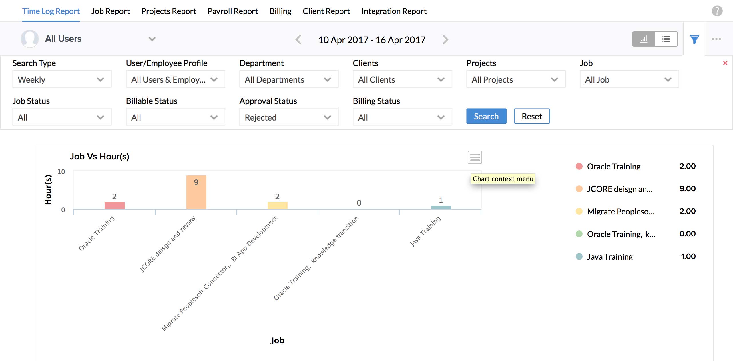 I would like to know the number of hours spent on a particular job for a particular period for all users. How?