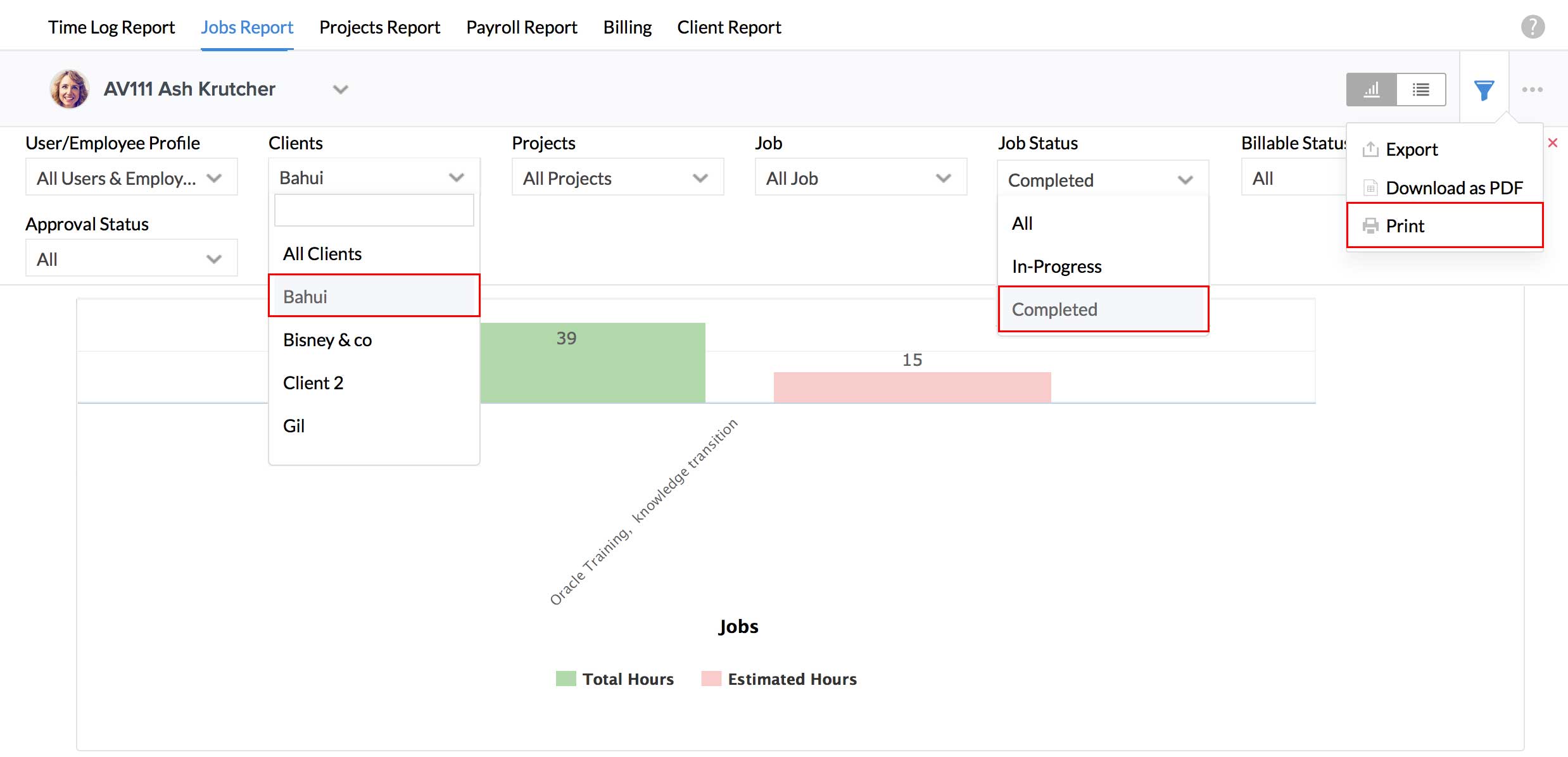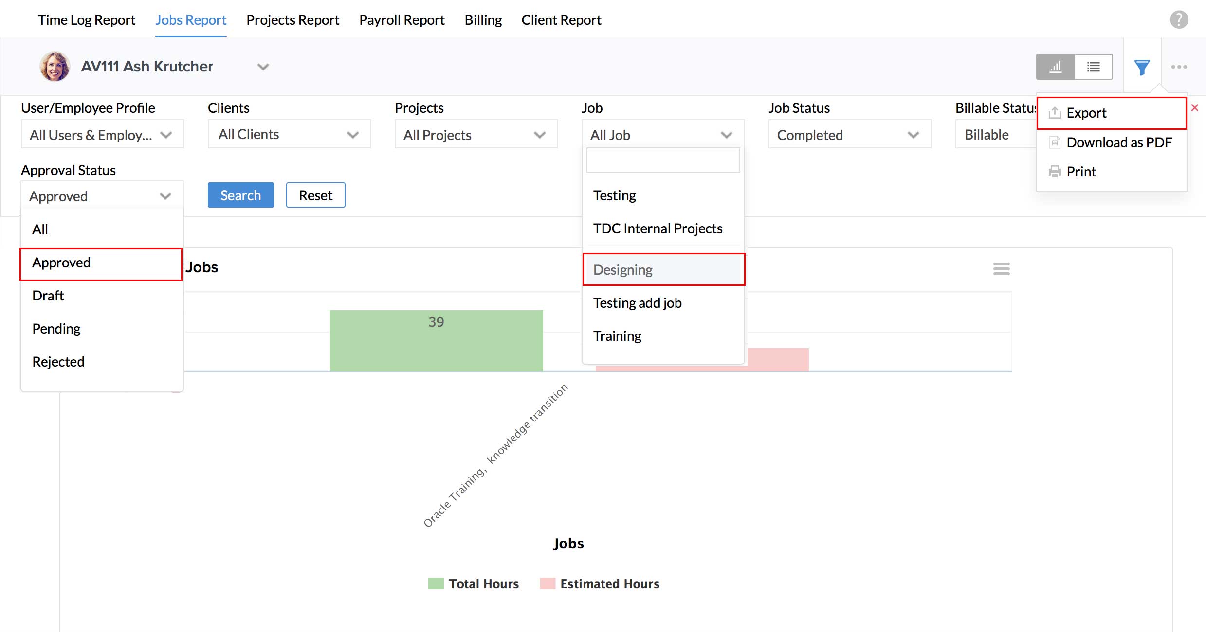 I would like to export a report of billable and approved hours of a particular job. Is this possible?