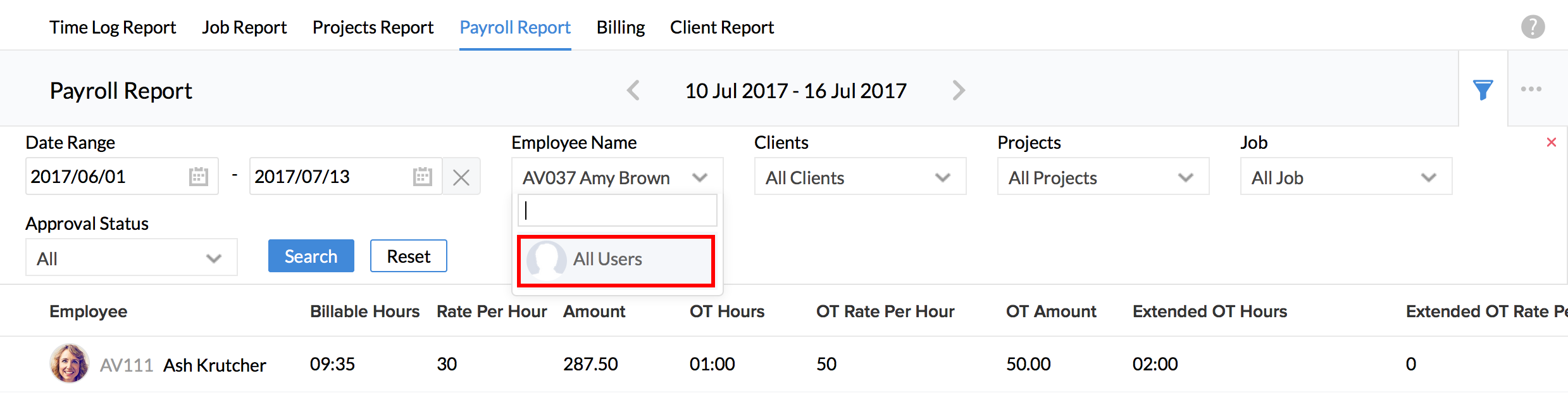 - Under Employee Name dropdown, select 'All Users'