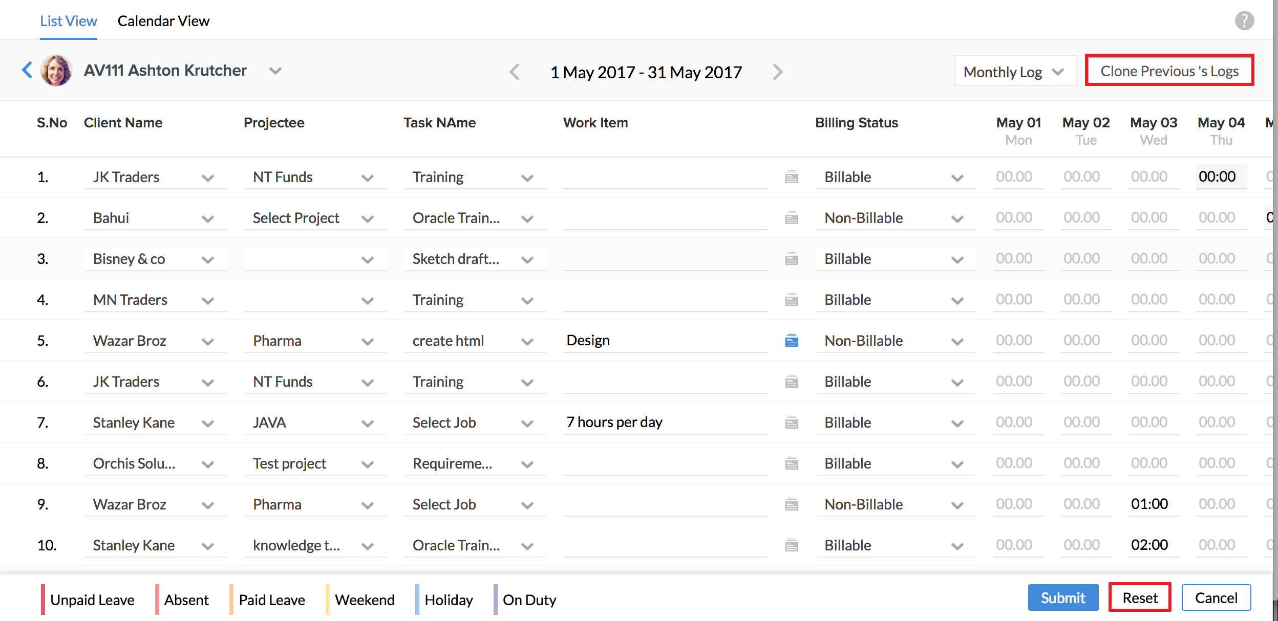 Hence, the monthly report will end with Thursday . The total number of billable log hours of Wednesday and Thursday (for the last week of the month) will be calculated as Average hours per day x 2.