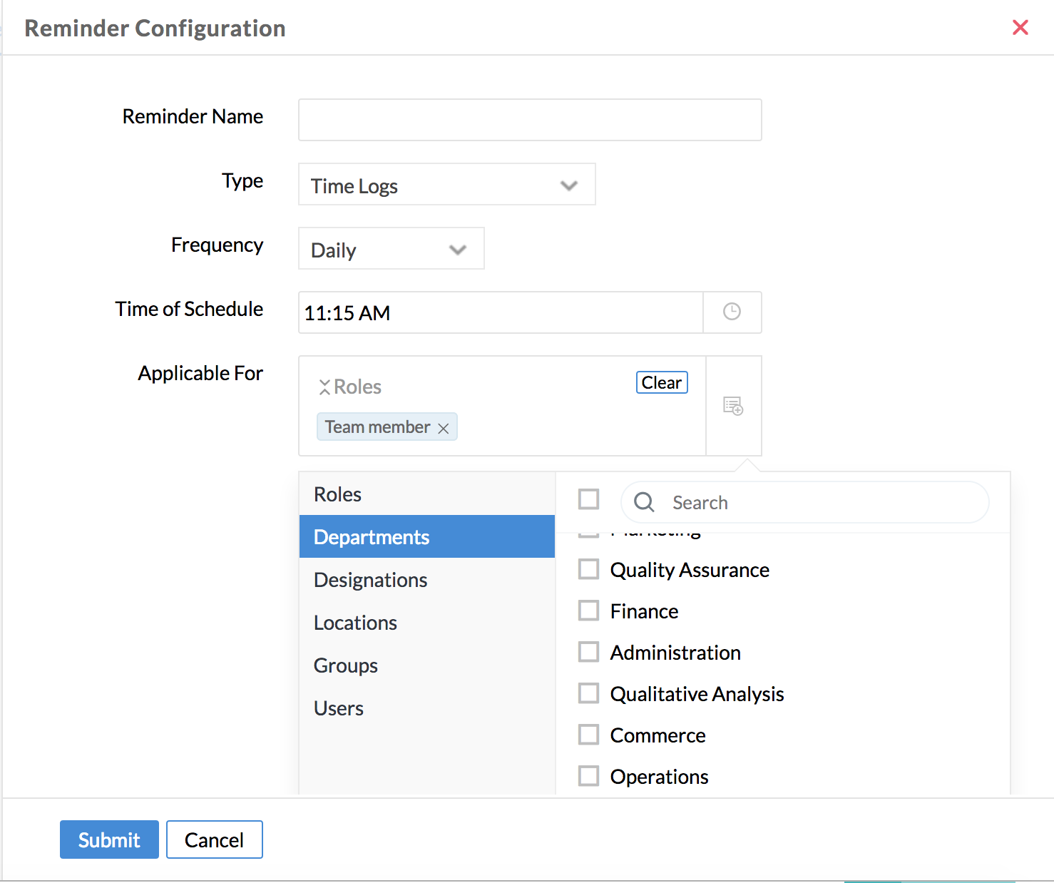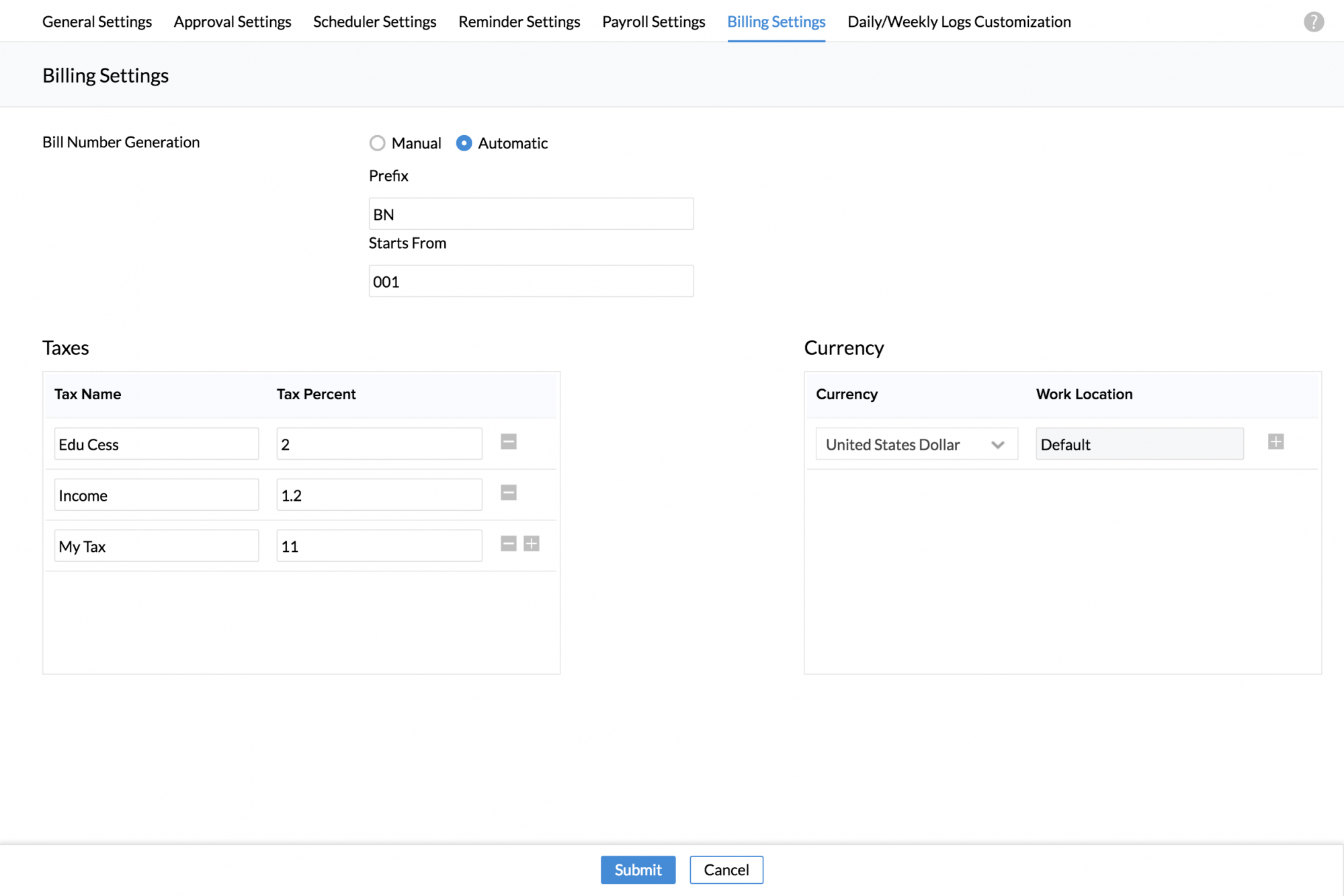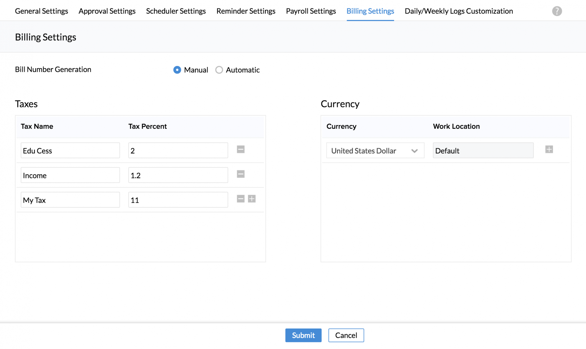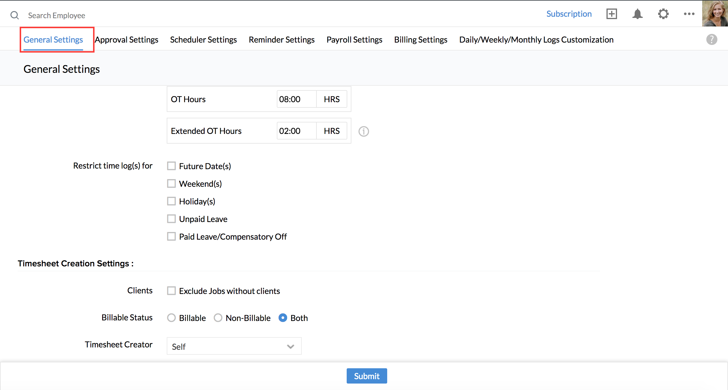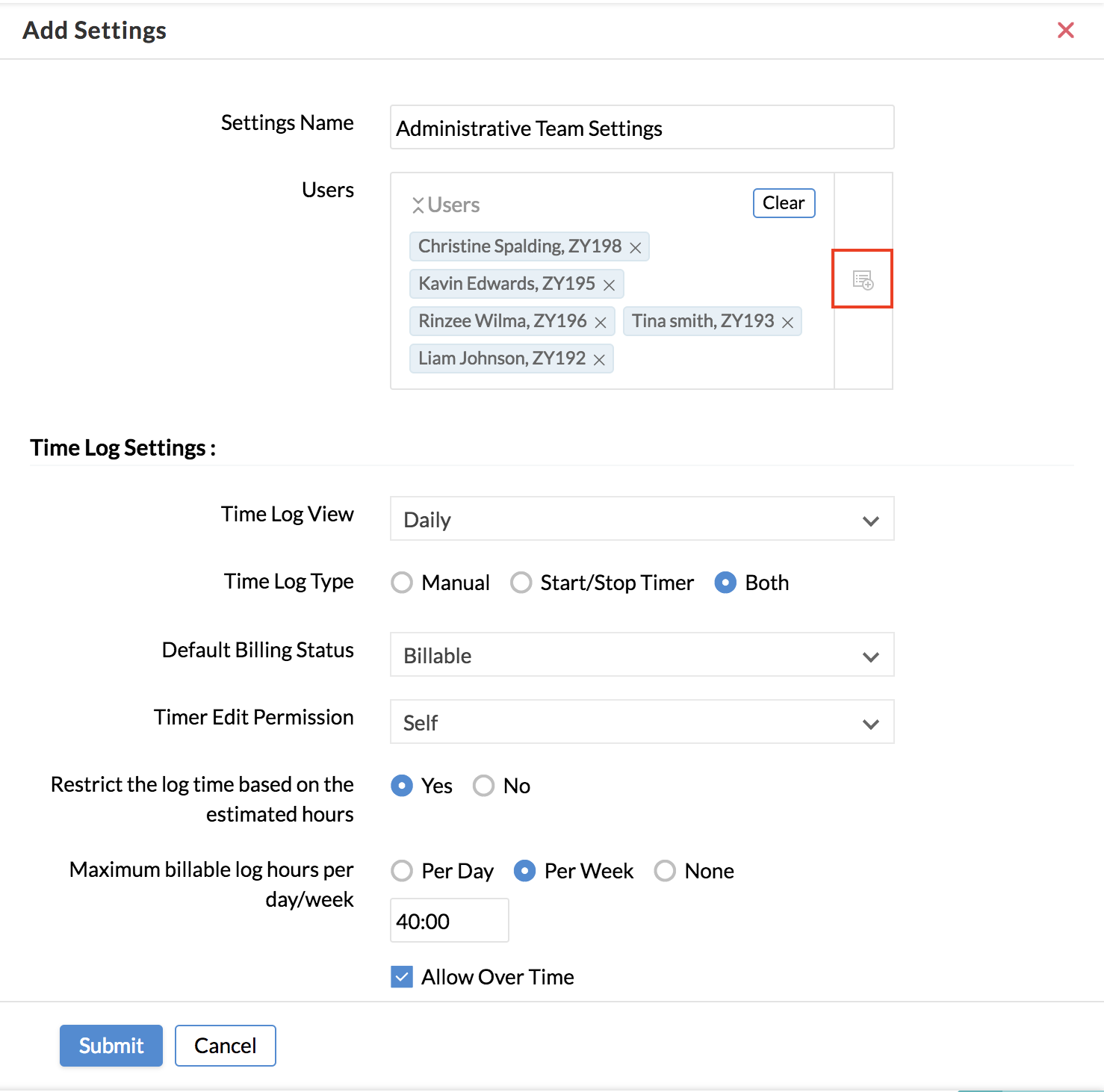 User Settings lets you configure Time Log settings that are specific to particular User(s). This comes to use when you would like to set permissions to certain users alone, different from the rest of the organization.