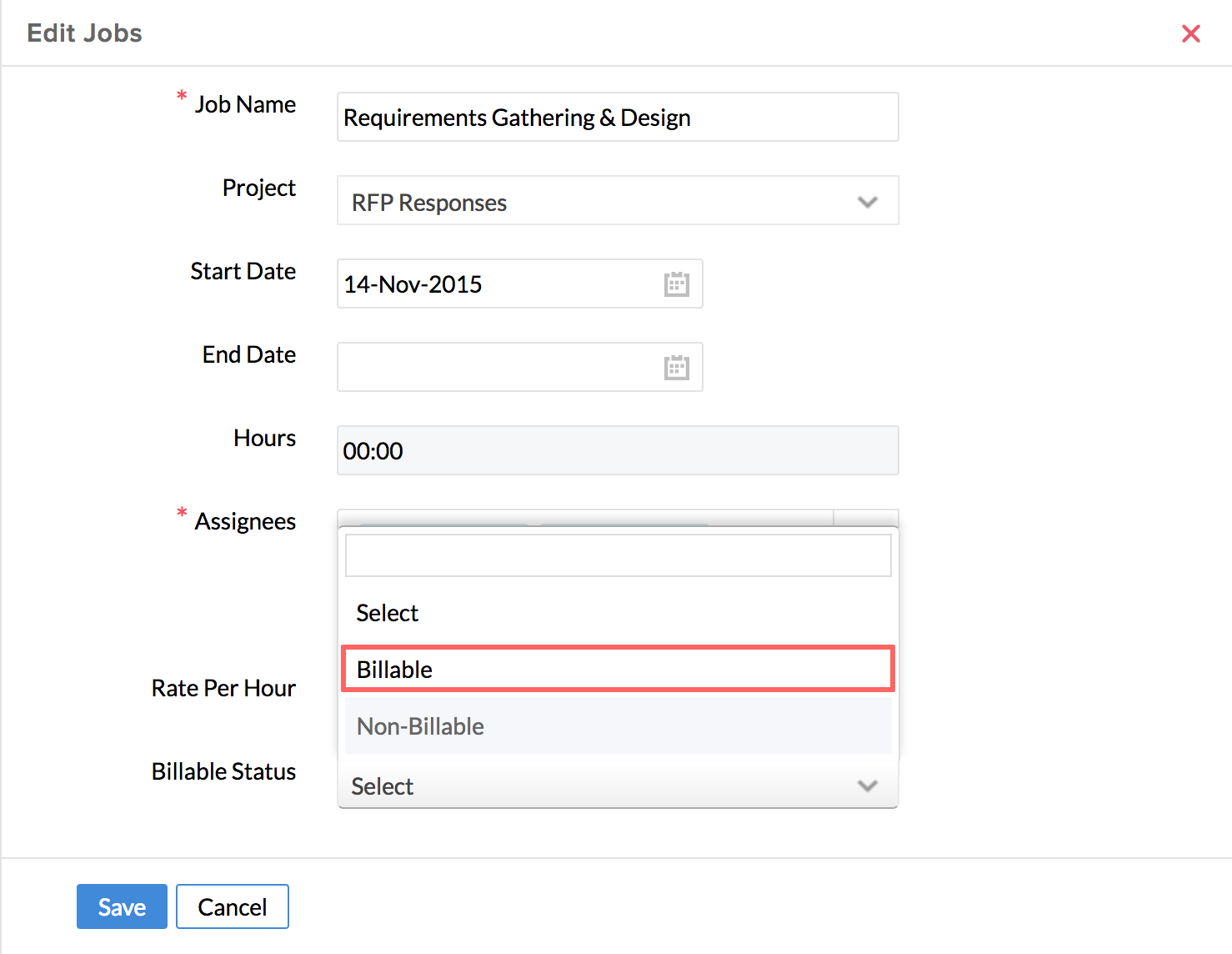 - Under Billable status, select Billable or Non-Billable depending on the nature of the job
