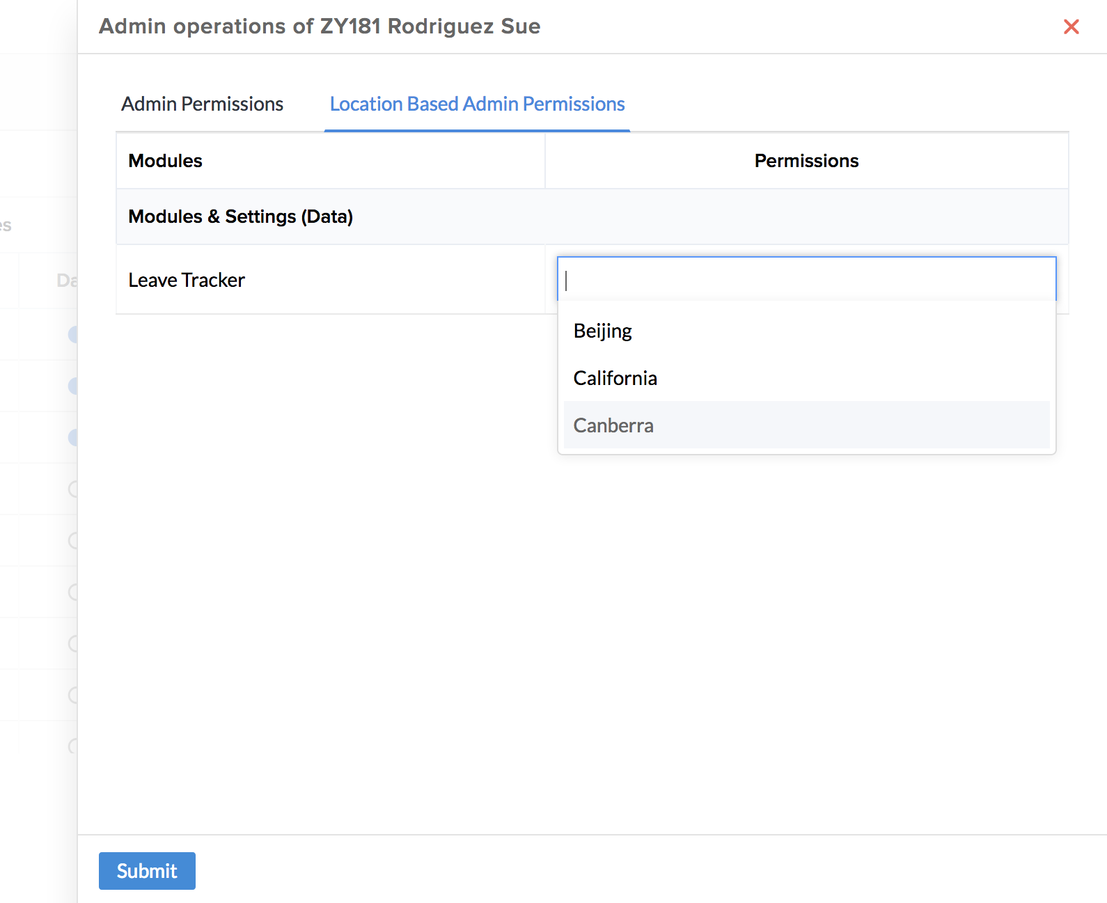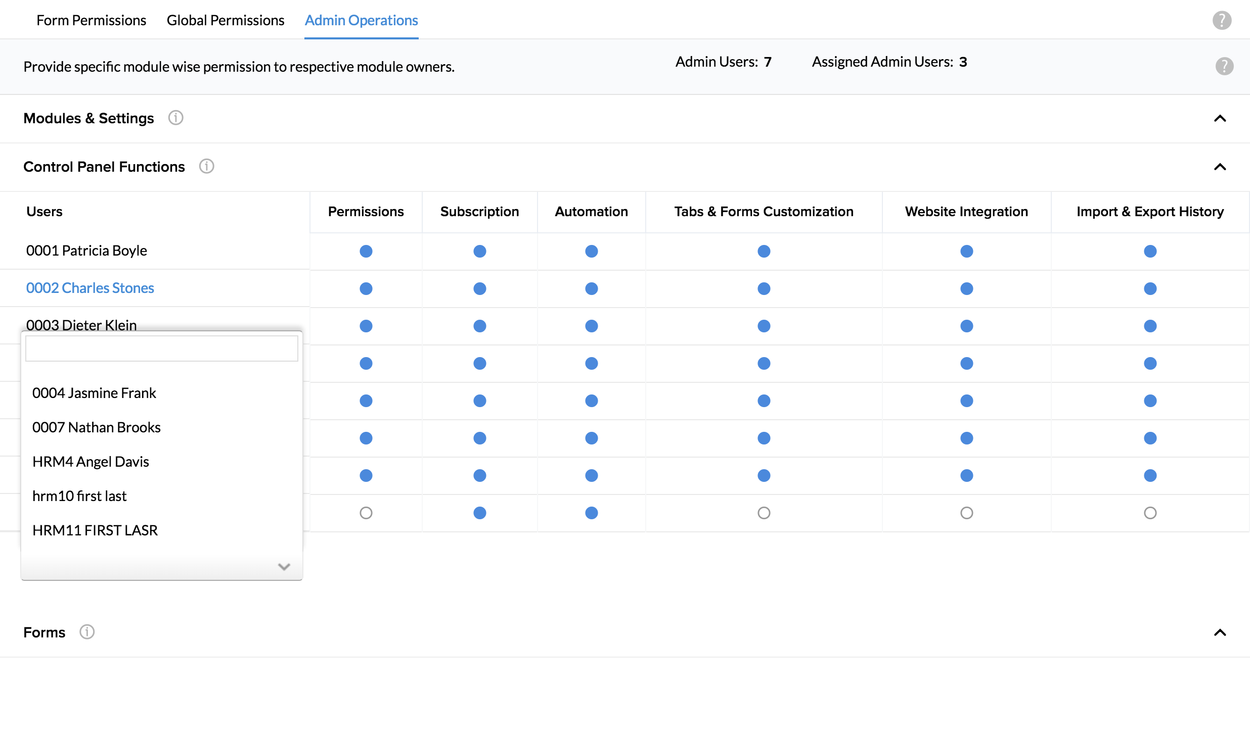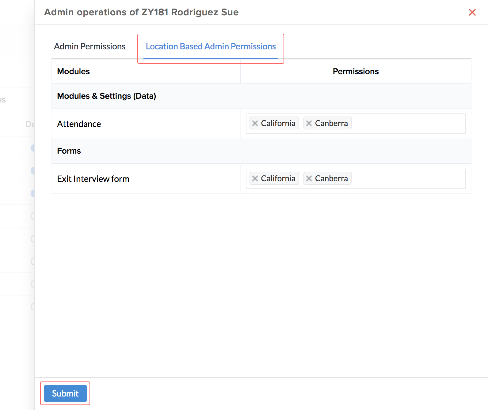 Note: You will be able to see the 'Location Based Admin Permissions' tab only when you select forms which have fields associated with locations.
