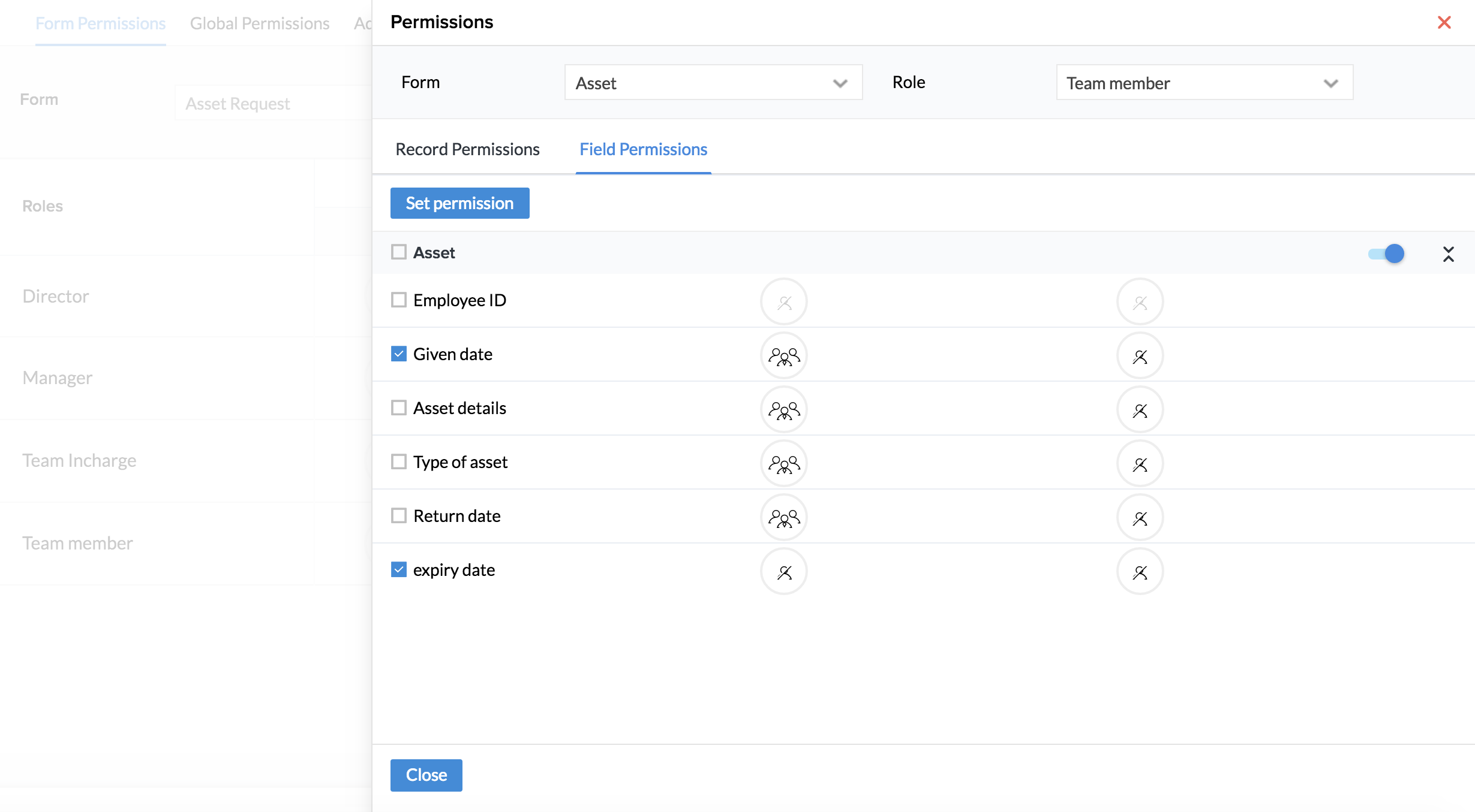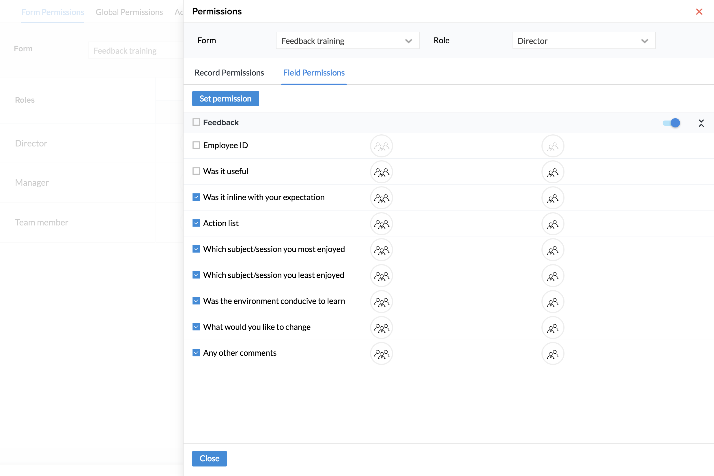 For eg. If you would like to give permission for Manager and Project Lead role to View their own data plus their subordinates' data pertaining to that particular field, then select subordinates' data + My data icon under roles, Manager and Project Lead.