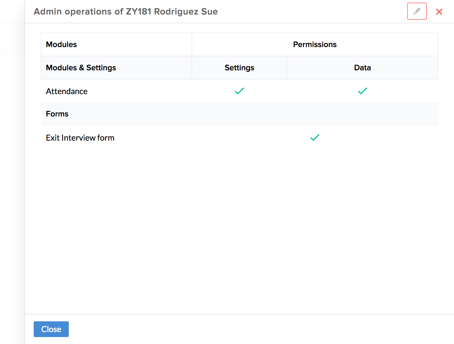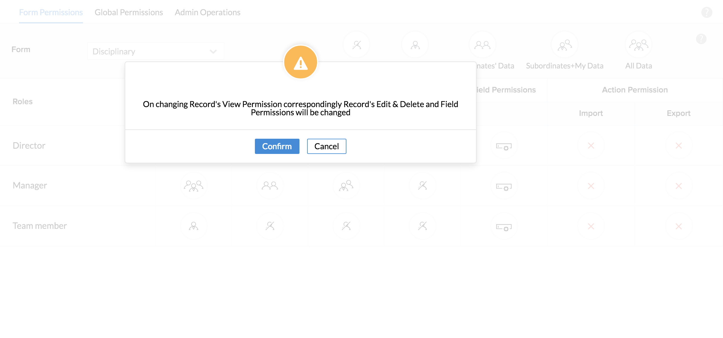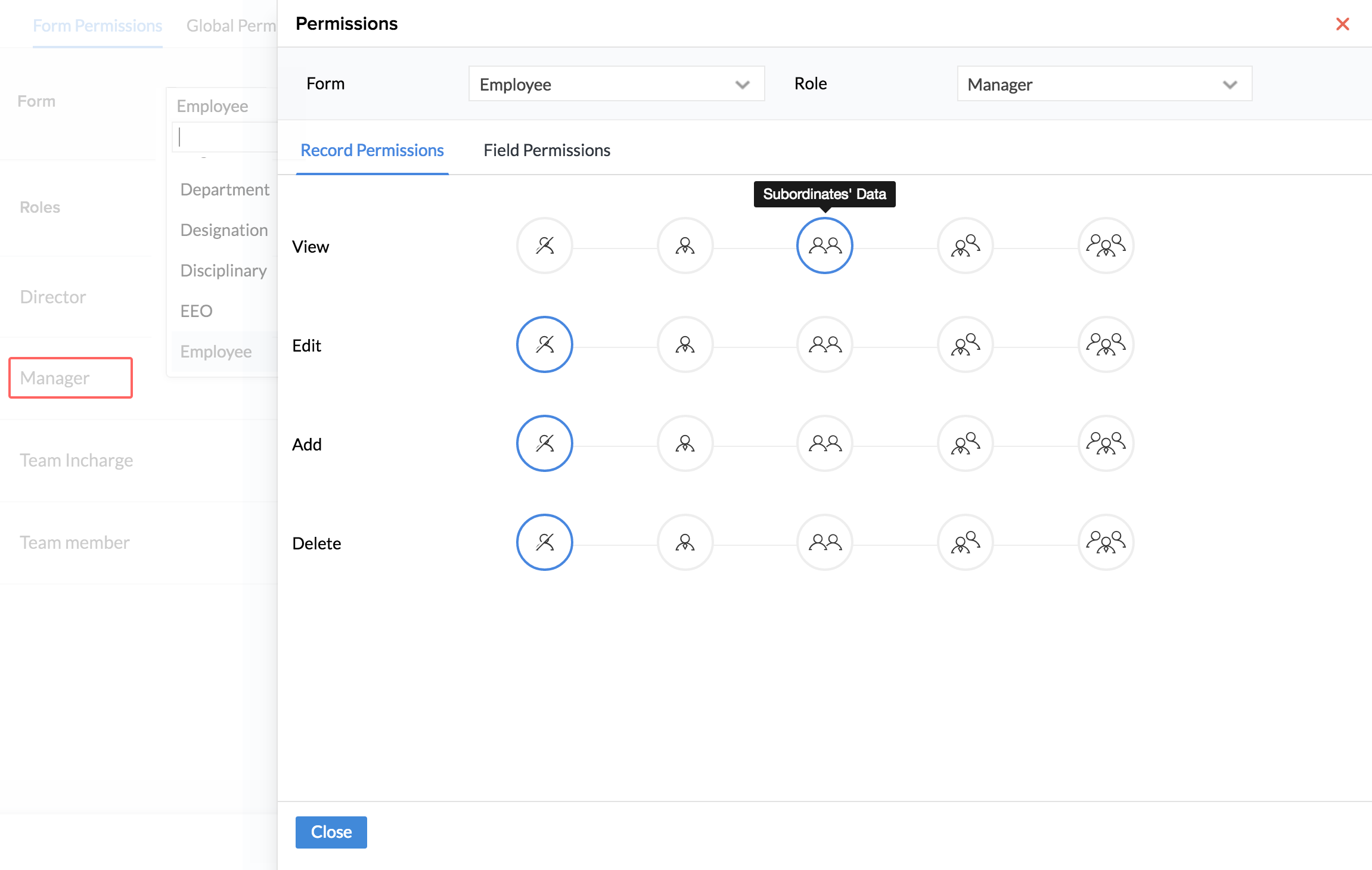 Note: To set Add or Edit permissions for a record, you should have first configured View permissions for the same. Also, if you would like to give Edit/Add permission for subordinates' data + My data, you cannot do it unless you have given View permission for Subordinates' data + My data. In other words, permissions to view records should be set before setting permissions to edit or add the same record.