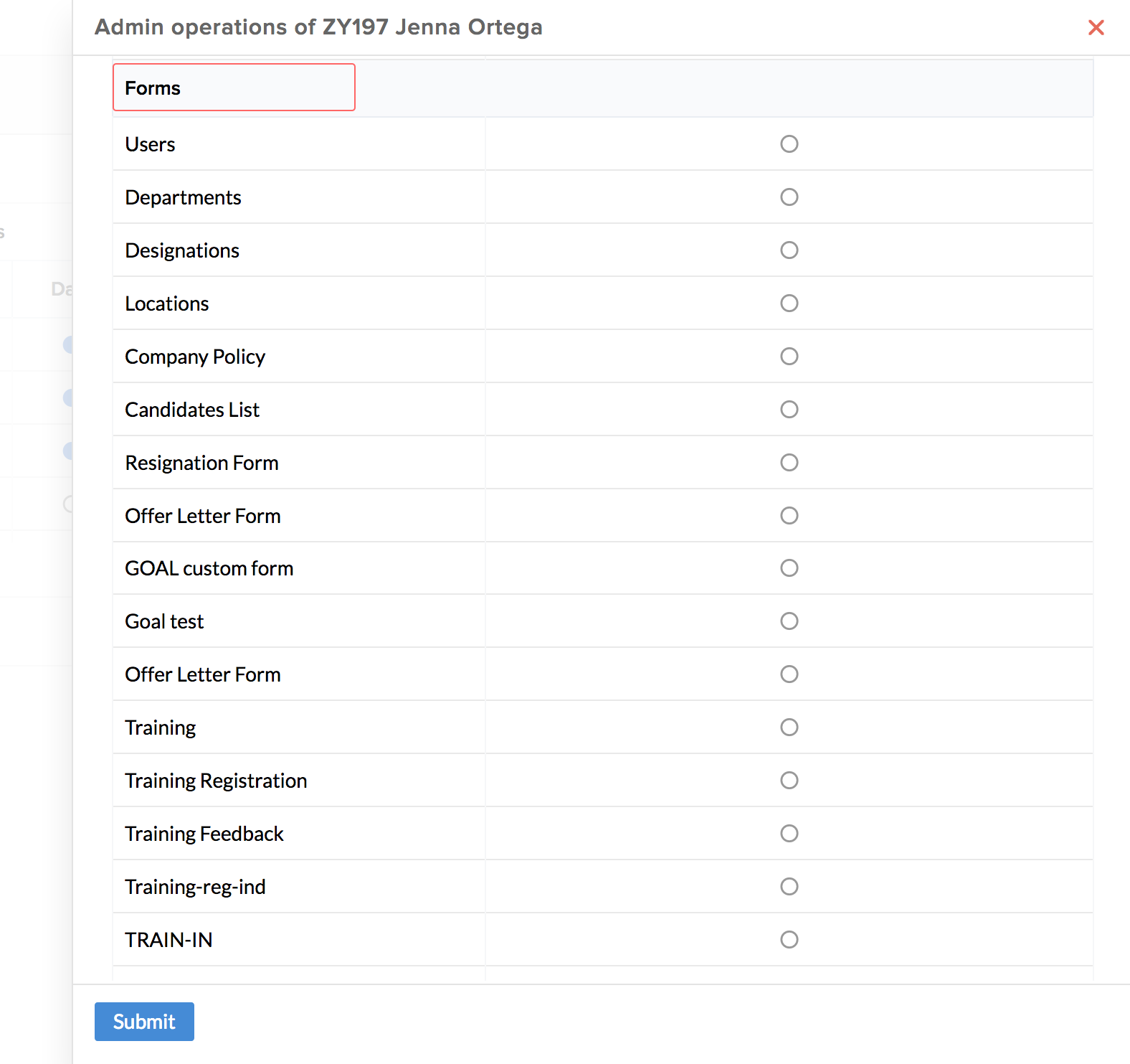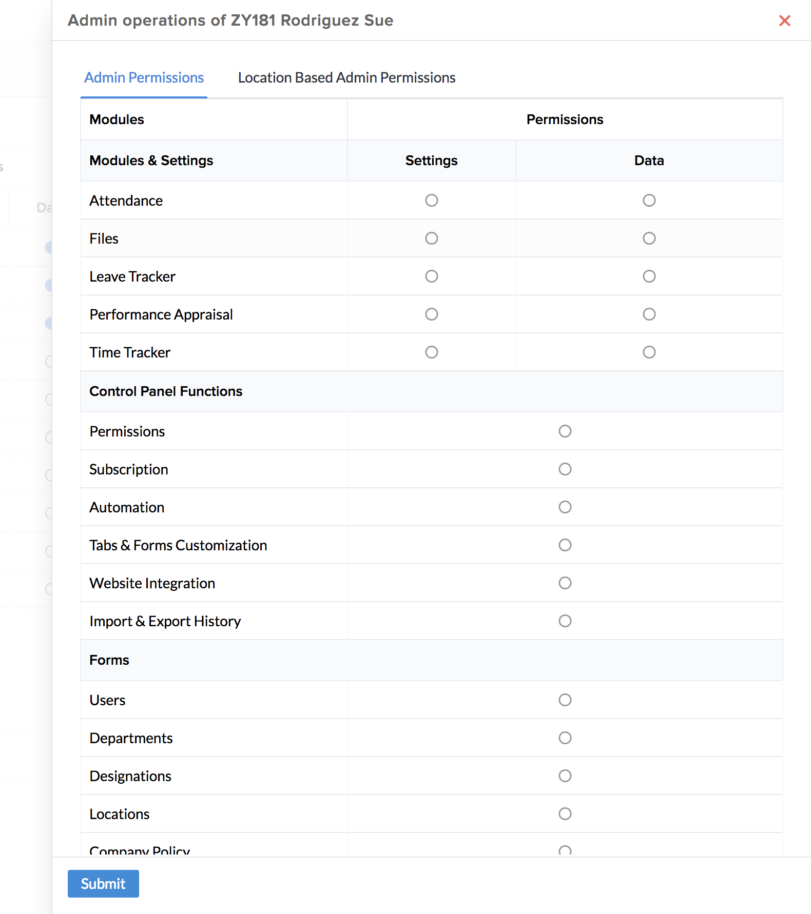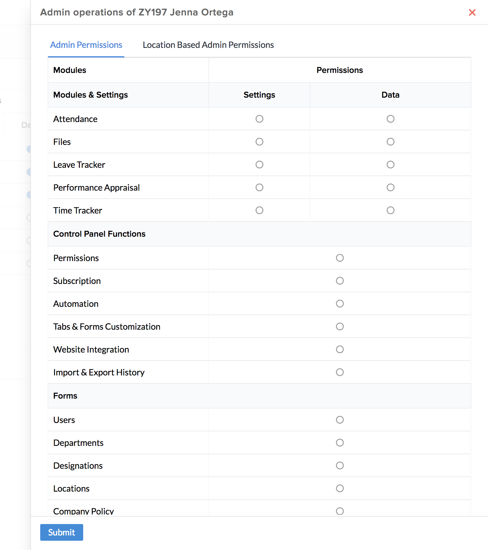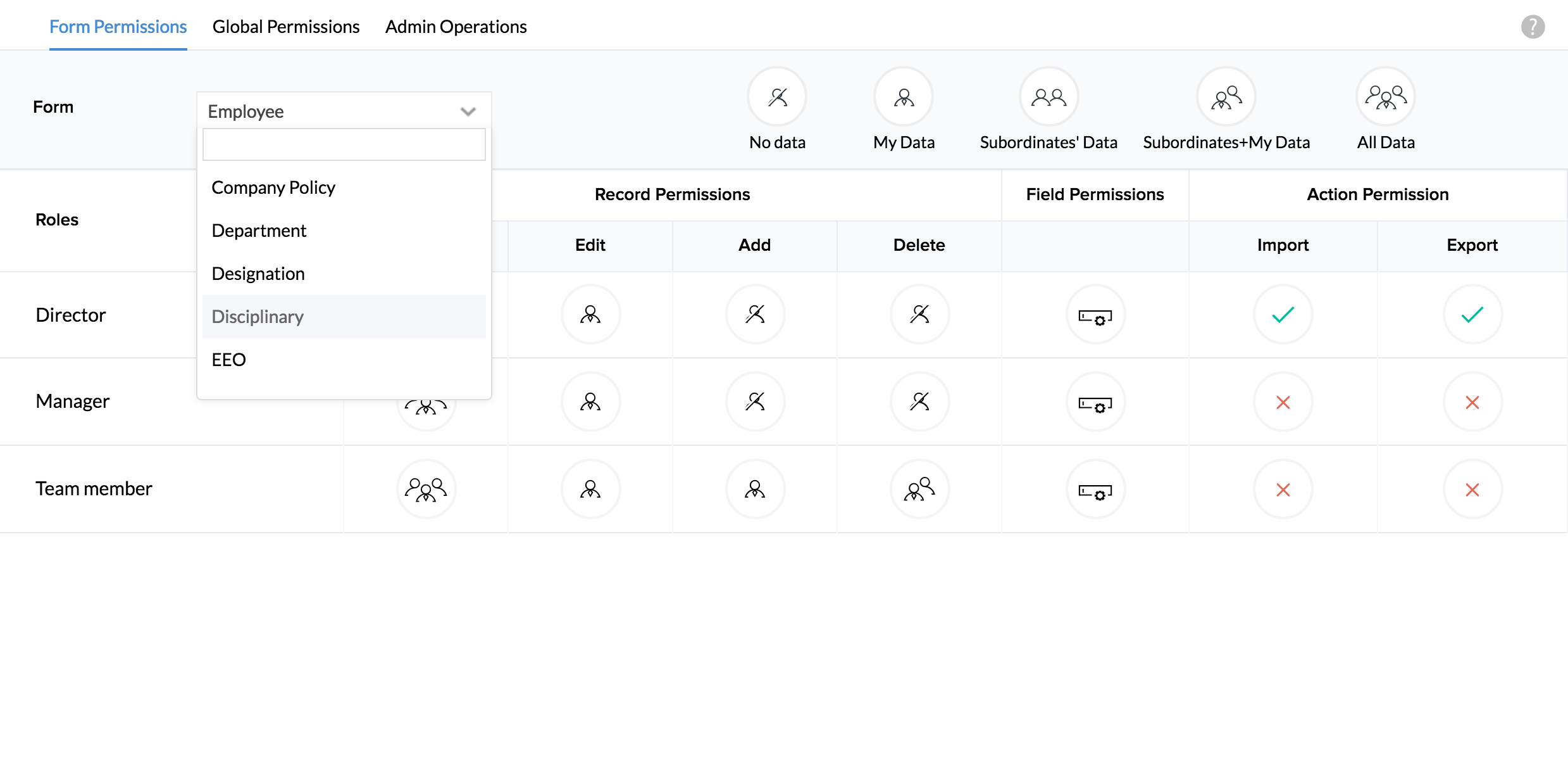 To configure any other permissions (Add/delete/Import/Export) click Form permissions,and enable it in the Form Permissions page. Here also, you need to choose the type of data (My data/No Data/All data/Subordinates' data/Subordinates' data + My data) for which you would like to give access.