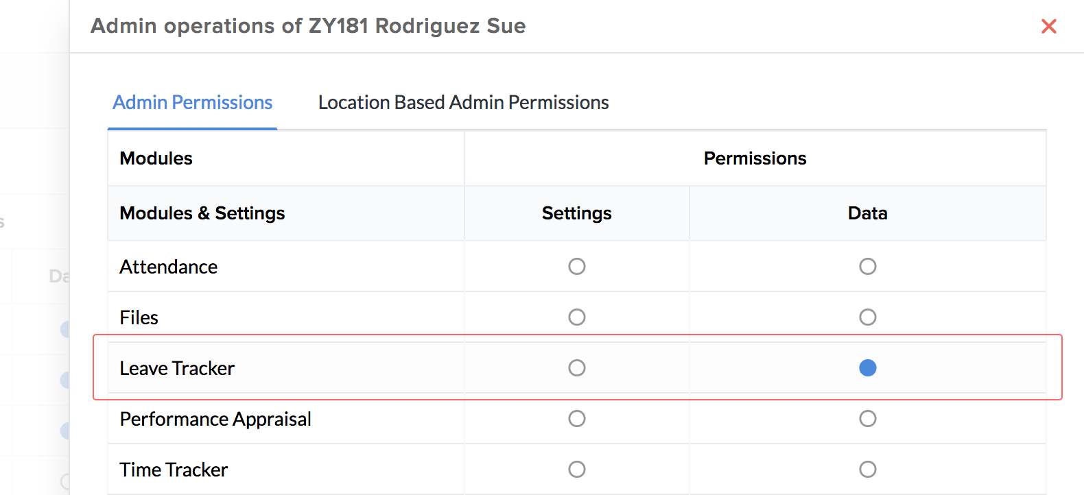 - Select the type of data (No data/My data/Subordinates' data/Subordinates' data + My data/All Data) for which you would like to set permissions