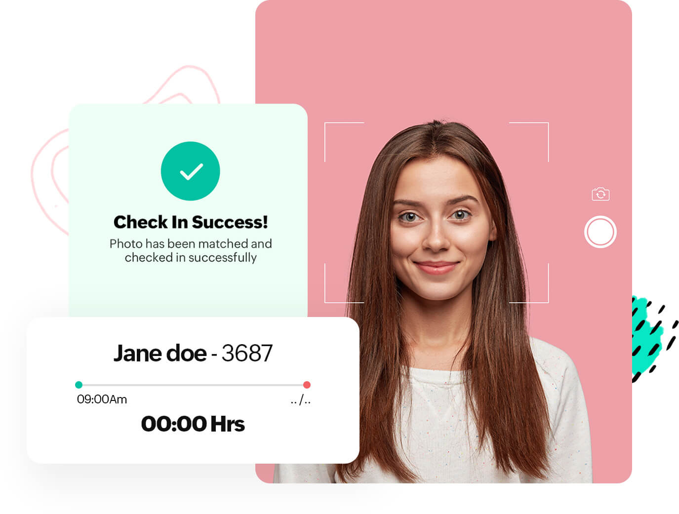 When employees clock in or clock out, they'll be asked to take a photo of themselves. Kiosk then uses AI technology to auto-verify that this photo matches the employee's profile picture in Zoho People and mismatches will be flagged.