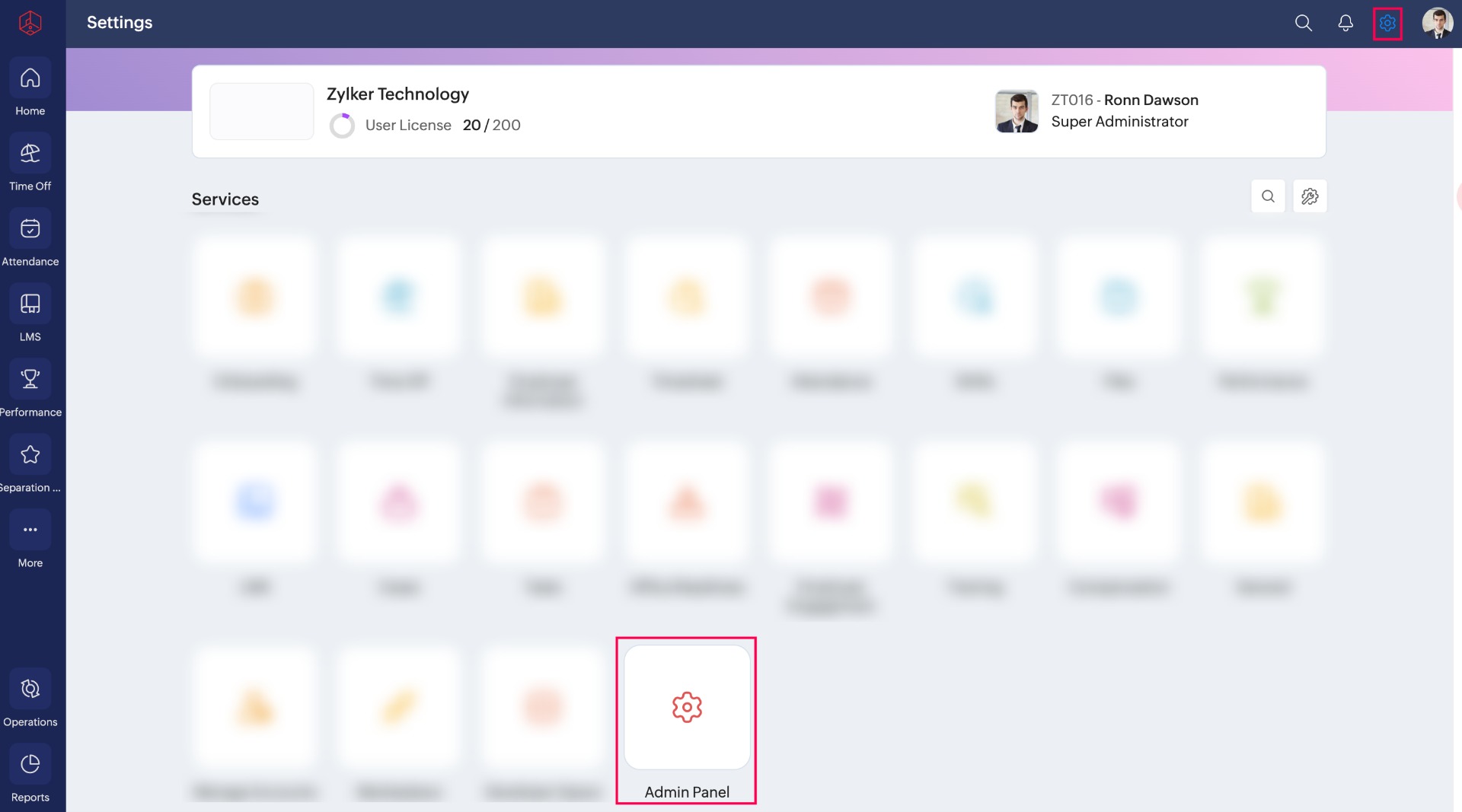To access the Admin Panel, navigate to Settings (gear icon on the top-right) corner in People Plus and click on Admin Panel.