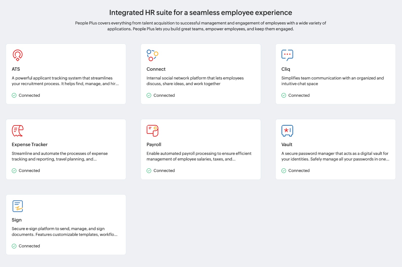 Zoho People Plus is an integrated suite of applications that help the HR team handle various operations for an employee. The People Plus bundle is a combination of apps that aid operations like Recruitment, HR process automation, Collaboration, Offer Letter Management, Expense tracking, and Payroll processing.