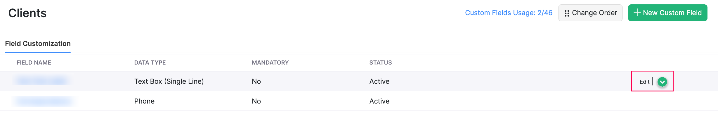 - Hover over the custom field you want to mark inactive and click the Dropdown icon.