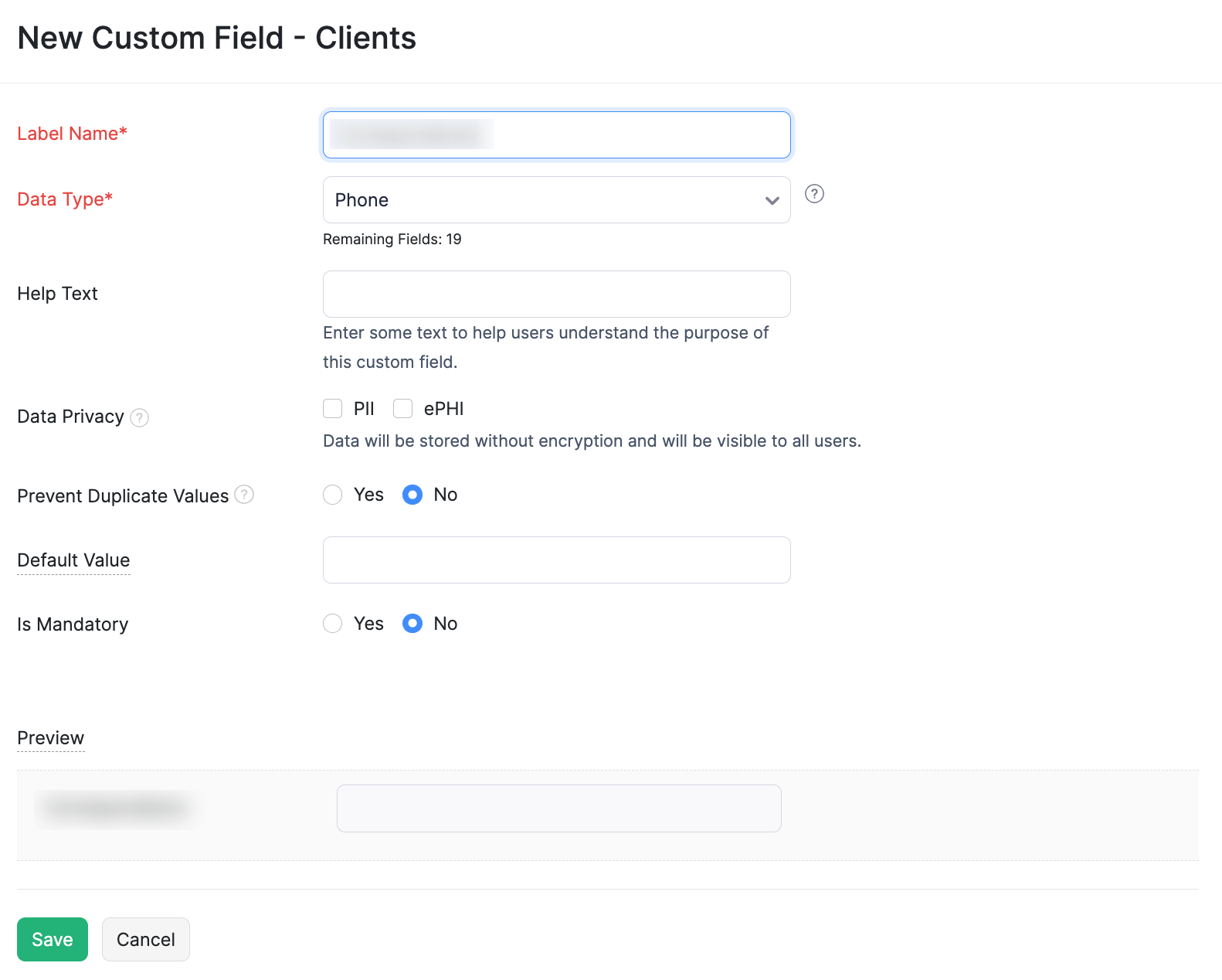 Select ePHI if the information that you enter can be used to identify a patient. For example, an electronic copy of a medical report will be ePHI. You can mark only fields such as Text, Email, URL, Phone, and Date as ePHI. The data will be treated as sensitive; therefore, it will undergo encryption before being securely stored. Only users with access to protected data can access the fields. Users cannot use this field to perform advanced searches.