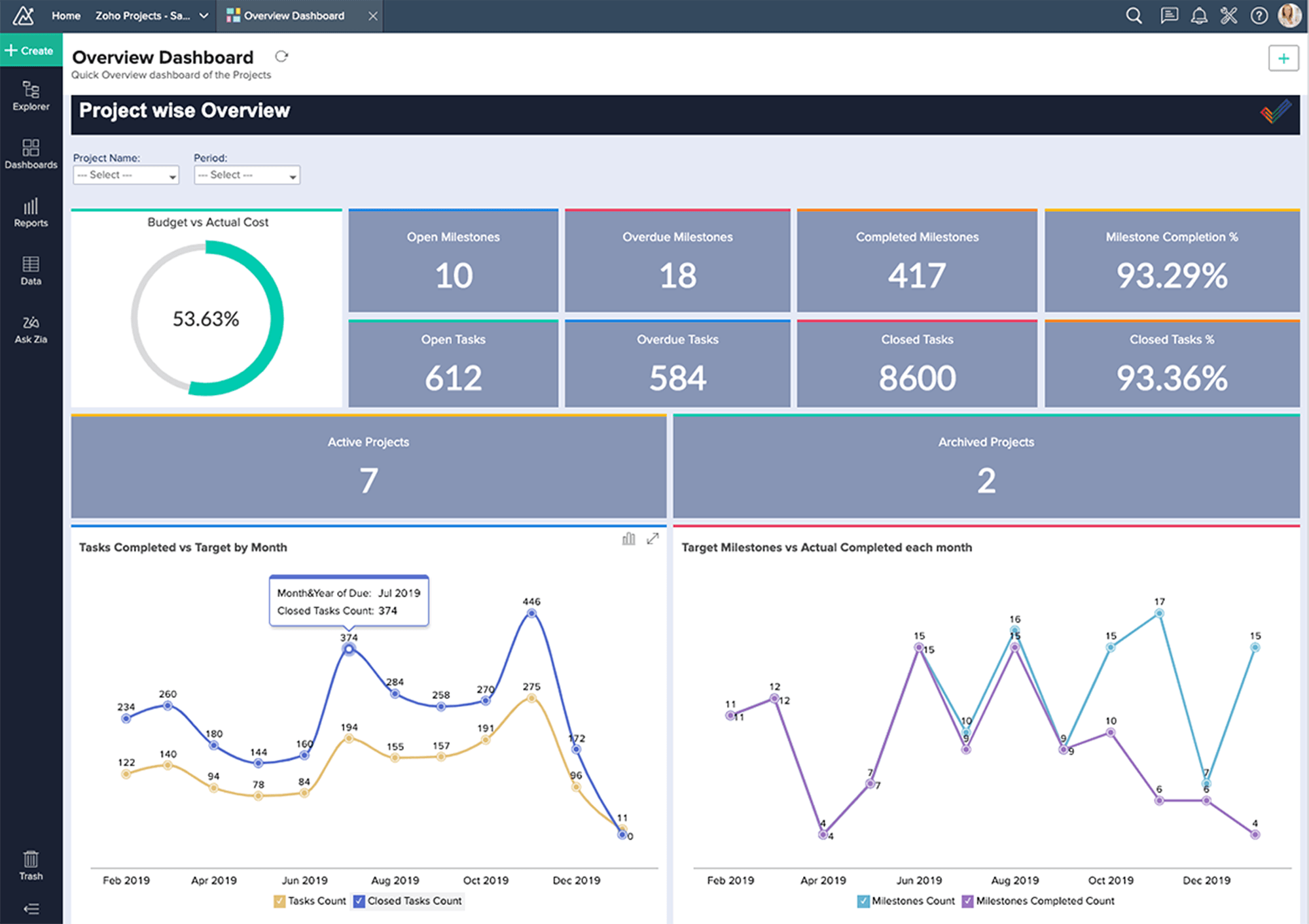 Combine data from different modules to understand how your projects are progressing. For example, view the delayed tasks and milestones by users, analyze the completion rate, calculate revenue based on ongoing projects and so on. This helps you not only keep track but also manage projects proactively.