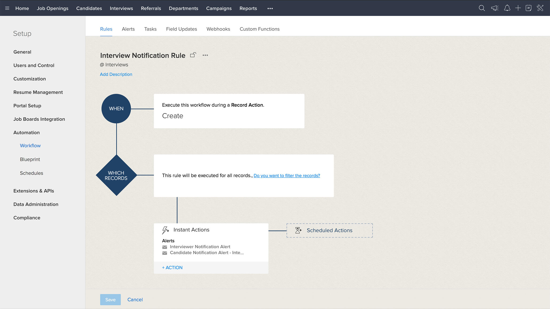 Collect and sort thousands of resume within seconds through our powerful resume parser. Reduce clicks and accurately parse candidate details by effective field mapping with our candidate relationship management software. Automate your hiring workflows with a set of pre-defined actions (alerts, tasks or field updates). For example, once an interview is scheduled, you can automatically notify the candidate and client about the interview with necessary information.