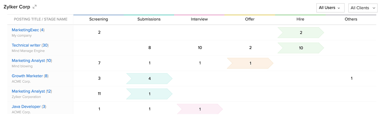 It can be hard to pick up where you left off when you're hurdling through the recruiting system. Zoho Recruit's candidate management software tackles this problem head-on by identifying and efficiently moving candidates through the various stages of the hiring pipeline. Get a consolidated view of all job openings and their associated hiring pipeline as a quick view on your dashboard, and keep a tab on your recruitment CRM.