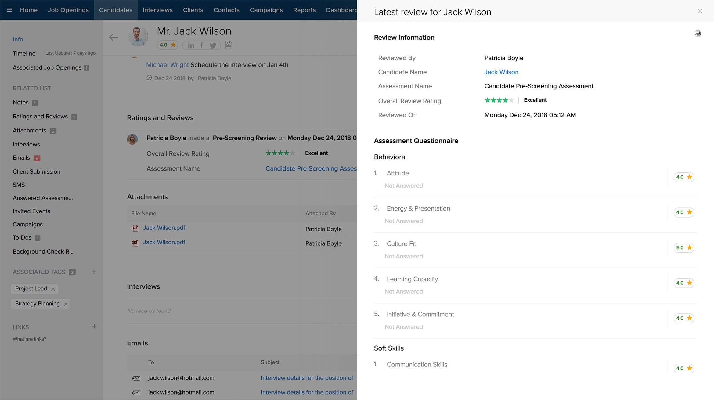 Create a structured hiring process and ensure every candidate is accessed consistently and fairly. Before the interview even begins, create an assessment with a set of default questions and add it to a job or send it to the candidate directly. Zoho Recruit's applicant tracking system allows you to use templates for consistent assessment.