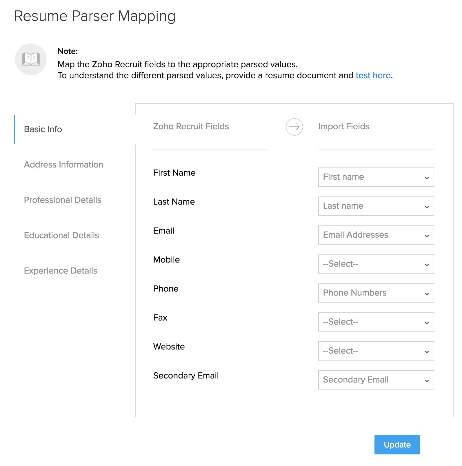 Resume extractor Find an interesting resume online that fits your job description? Zoho Recruit's Chrome browser plugin can parse content from almost any webpage and add them as a candidate record into your account.