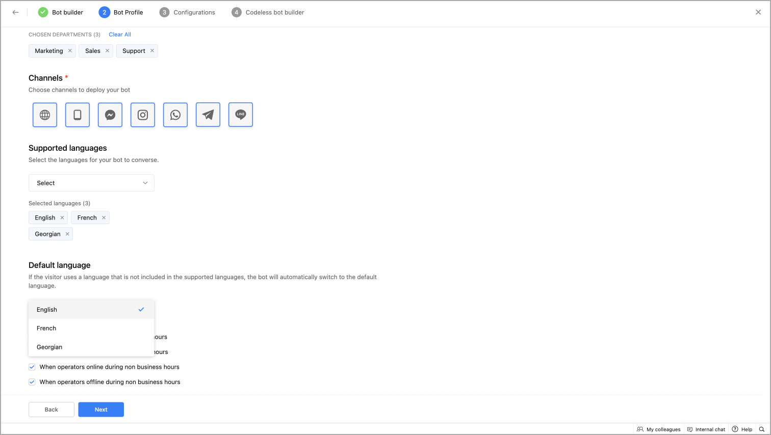 - You have to configure the bot's flow separately for the chosen languages