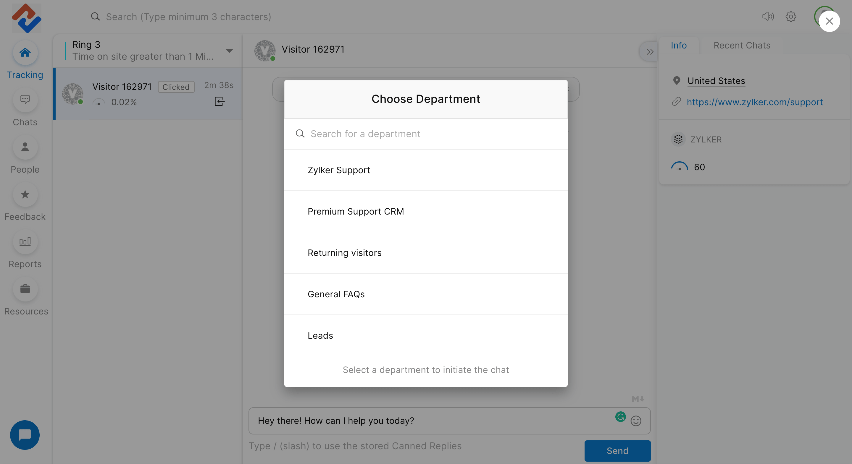 - You can type the message in the text box given, which you can find at the bottom of the visitor tile. Then hit "Send," right after which you can choose the departments.