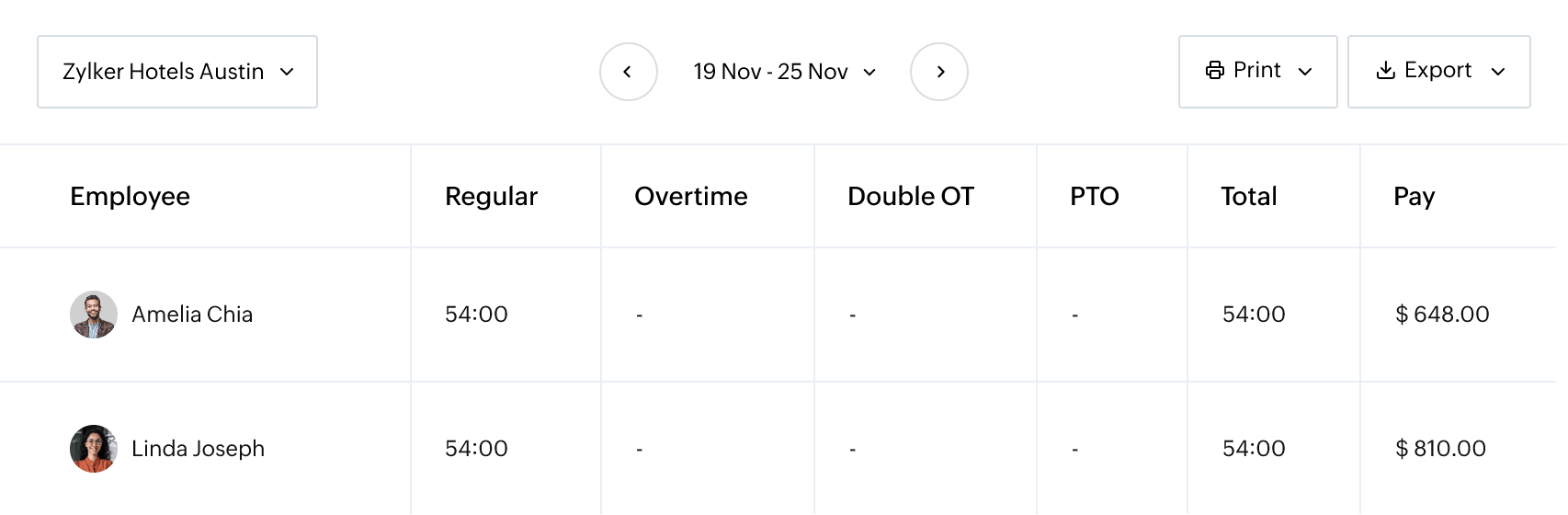 Review the timesheets and pay rates assigned to each employee or designation, and export the data directly to your payroll software.