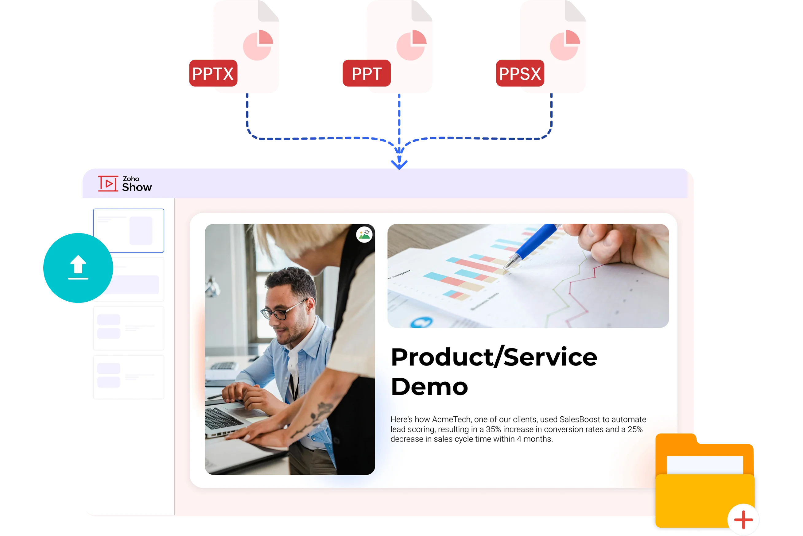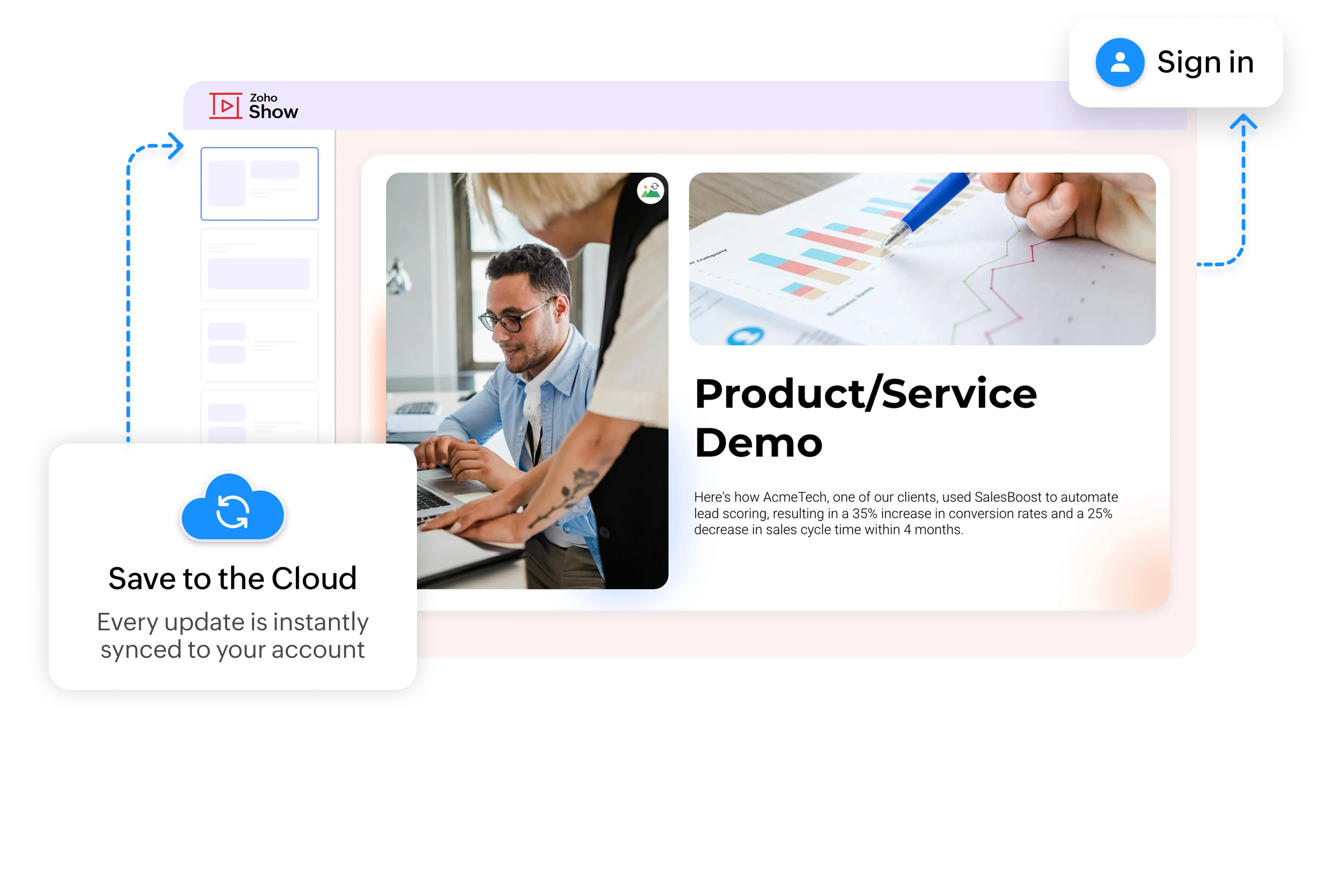 From first draft to final pitch, do it all on your desktop. Zoho Show lets you build and deliver great presentations on Mac and Windows-anytime, anywhere.
