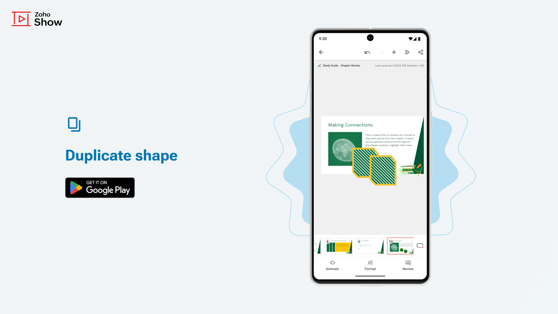 Start creating presentations on the web, access them on the go from your iPhone or iPad, and use the Zoho Show app for Apple TV to deliver your sessions on the big screen.