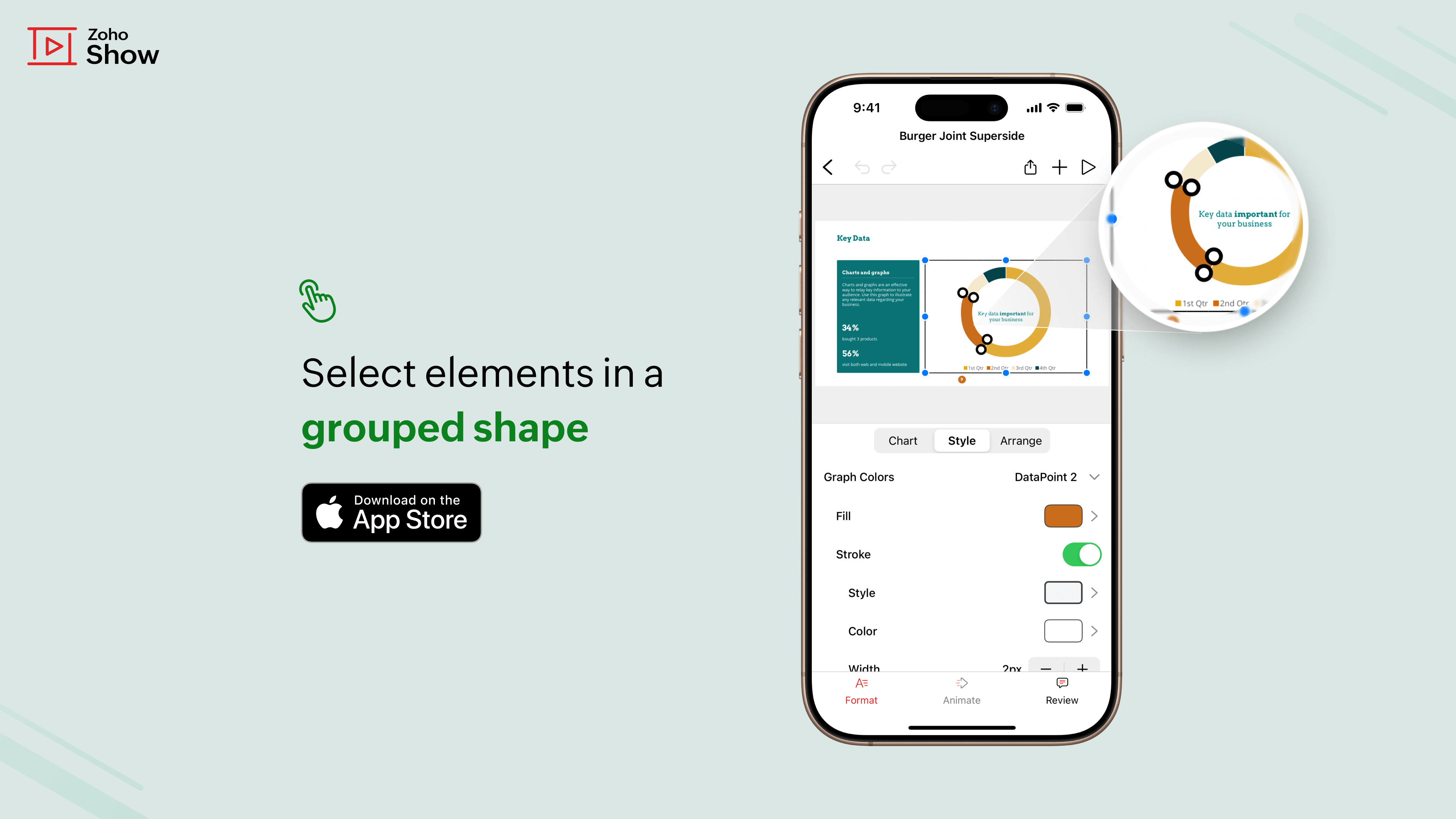 With Zoho Show's latest update, all your charts and graphs are effectively reproduced. They are now shipped in their exact format without being converted into images. The next time you import/export your .ppt/.pptx files into Zoho Show, you will find the graphs, pie charts and other illustrations of the same quality. This includes their colors, texture and borders.