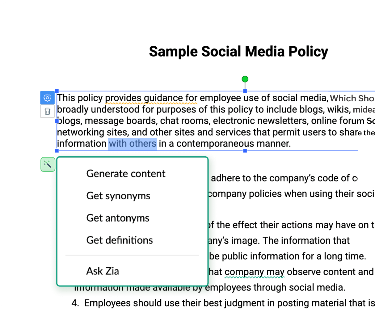 Use Zia's BluePencil on Sign templates in Zoho Writer (via the Zoho Sign extension) to elevate your content. Generate, edit, and summarize content, suggest synonyms and antonyms, punctuate sentences accurately, and improve the readability of your agreements with this tool.
