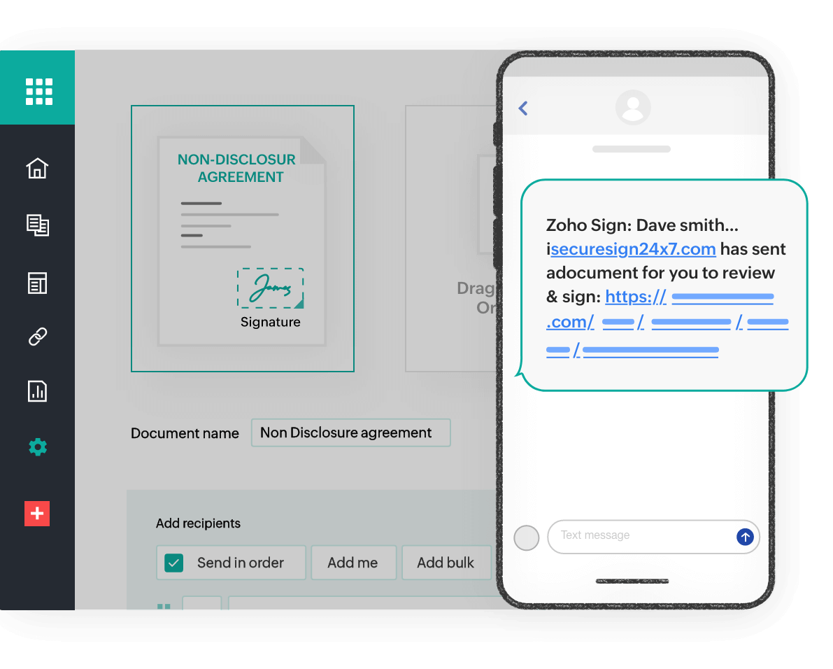 With the Zoho Sign option for SMS delivery, users can send documents for signatures or approval via SMS message in addition to email. This reduces the overall document turnaround time and boosts productivity.