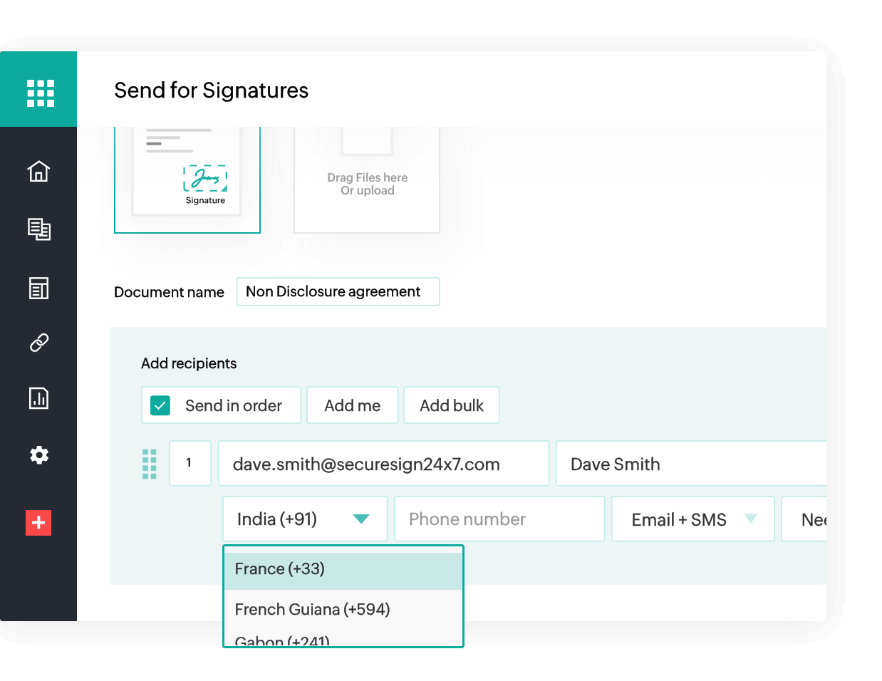 Users can select the option to send document signature requests via SMS to each recipient and enter recipient phone numbers when creating the digital signature workflow.
