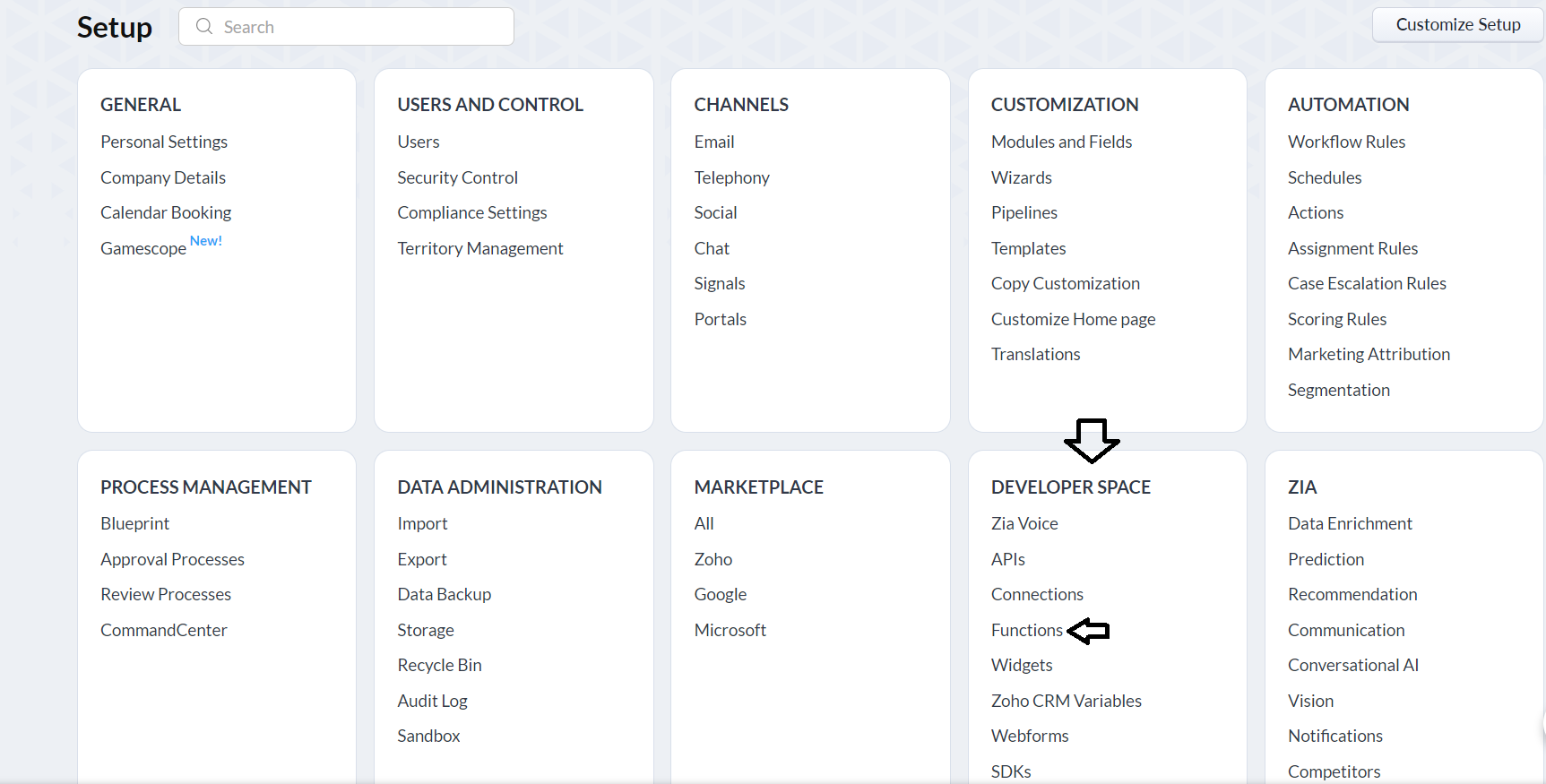 - Visit Zoho CRM and click the Settings icon at the top-right corner.