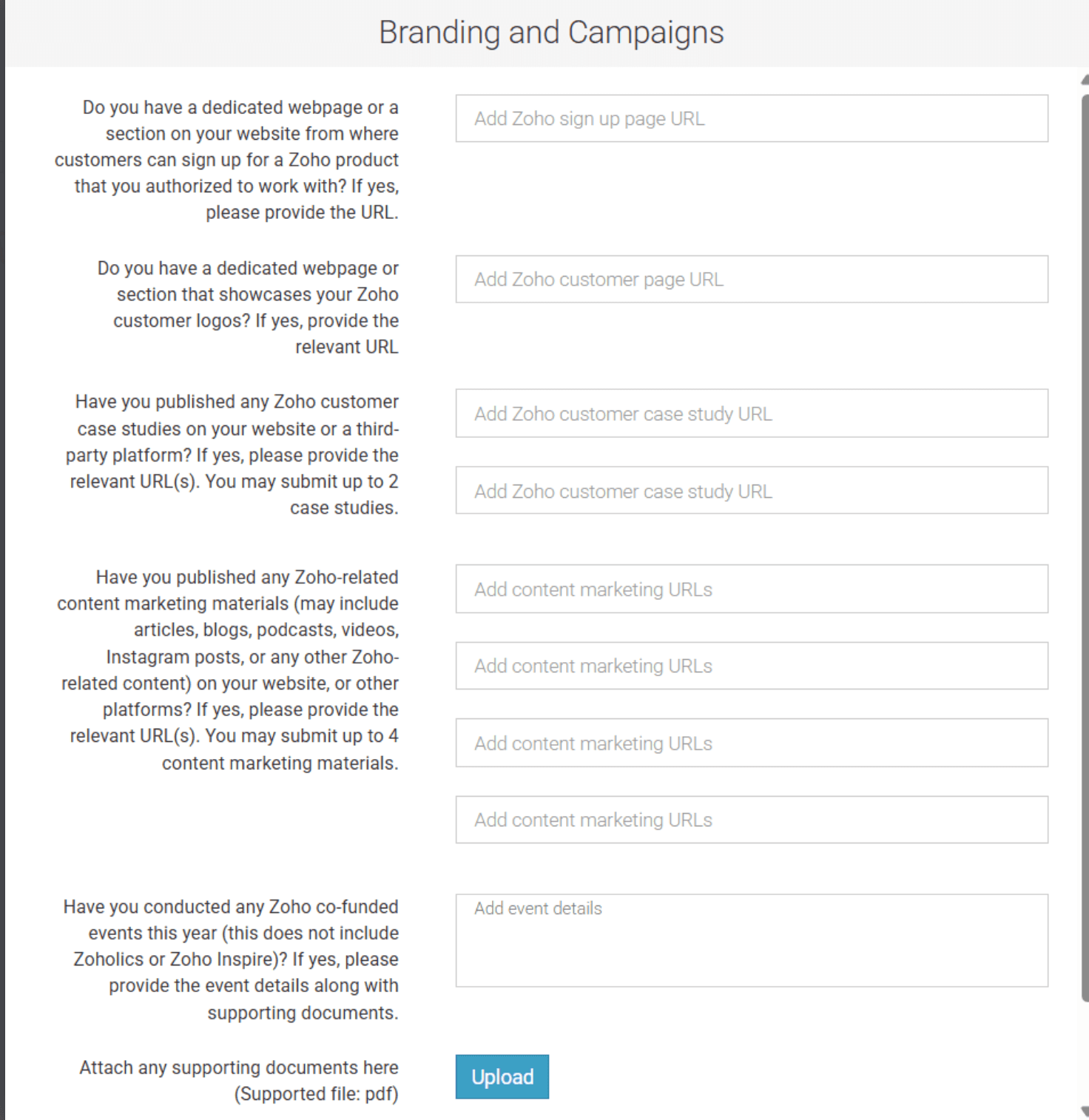 Branding and campaigns for partner tier evaluation: Partners are eligible to receive a maximum of 75 points for Zoho-relevant campaigns and branding initiatives.