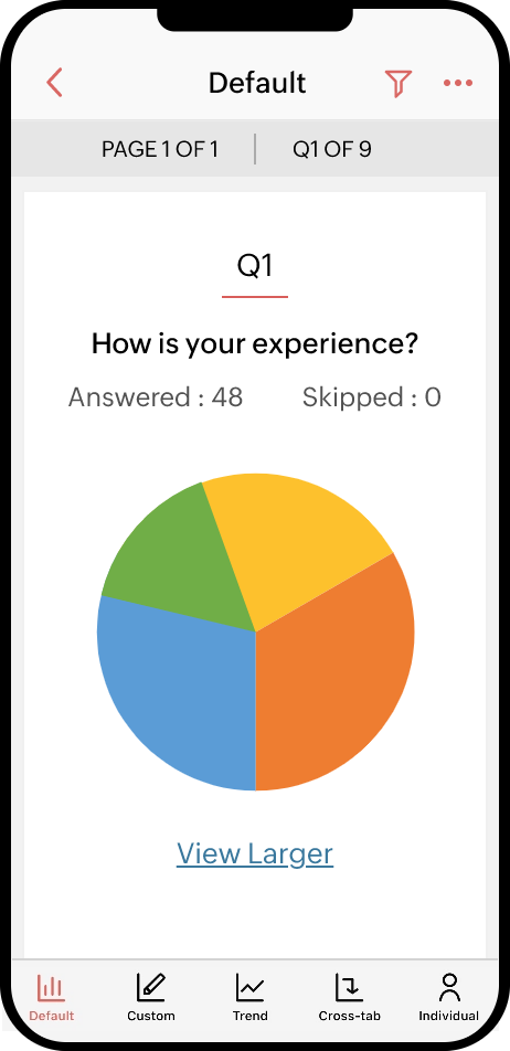Browse reports on the go. Create custom reports to view particular sets of data, and use cross-tab reports to understand the relationship between two questions. Trend reports help you analyze your survey traffic. You can zoom in on reports to enlarge your view.