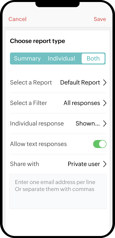 Instantly generate survey links and easily share them from the app. Quickly send your survey links through messaging apps (like Whatsapp), social media, or email. As soon as you receive responses, you can start analyzing reports right away.